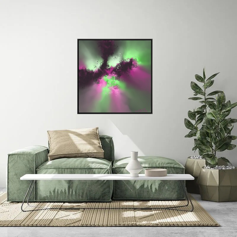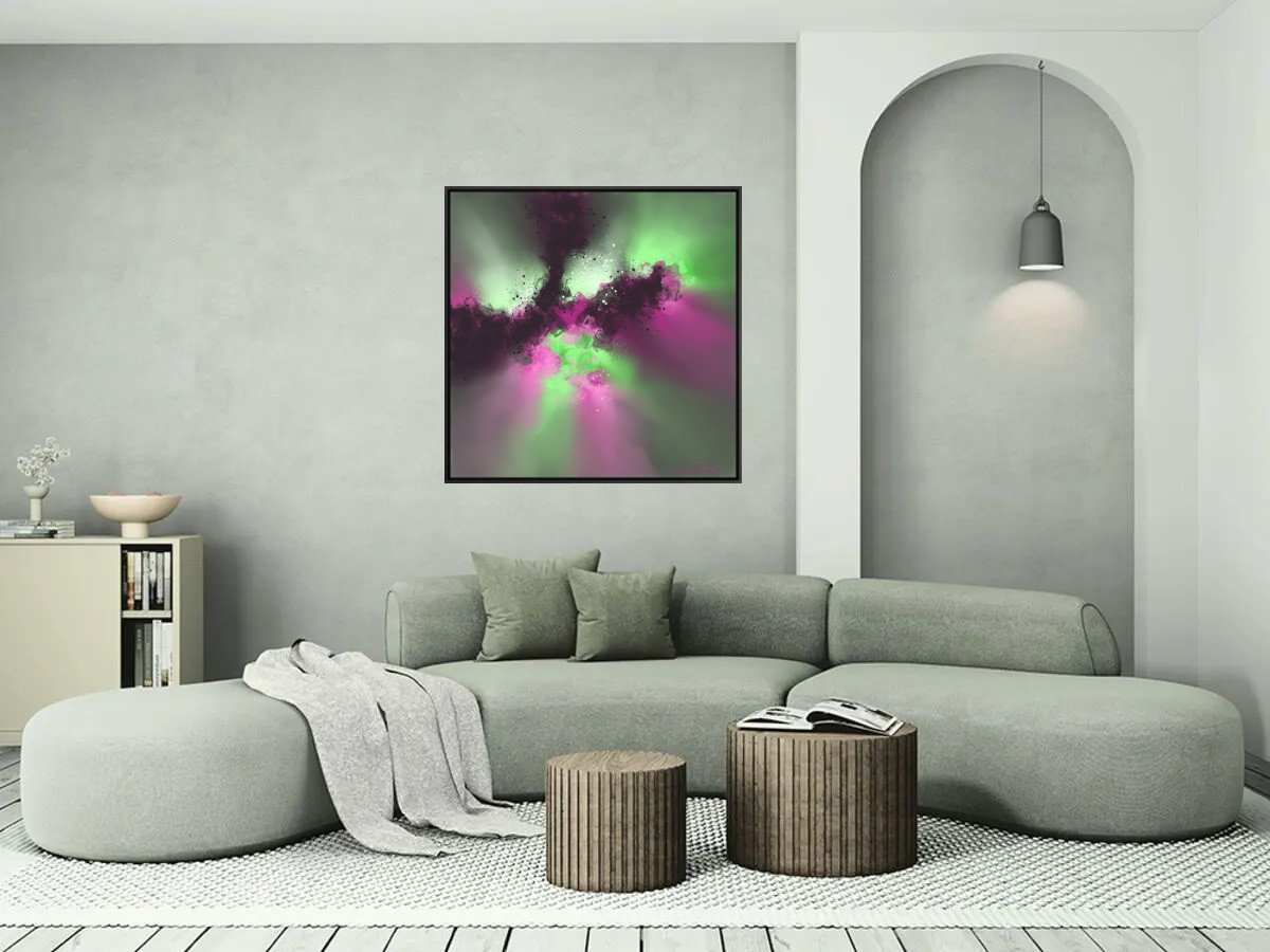 Vibrant swirls of purple, green, and black blend together, creating a cosmic and dreamlike atmosphere. Light and dark areas intermingle, resembling an abstract nebula or explosion of color.