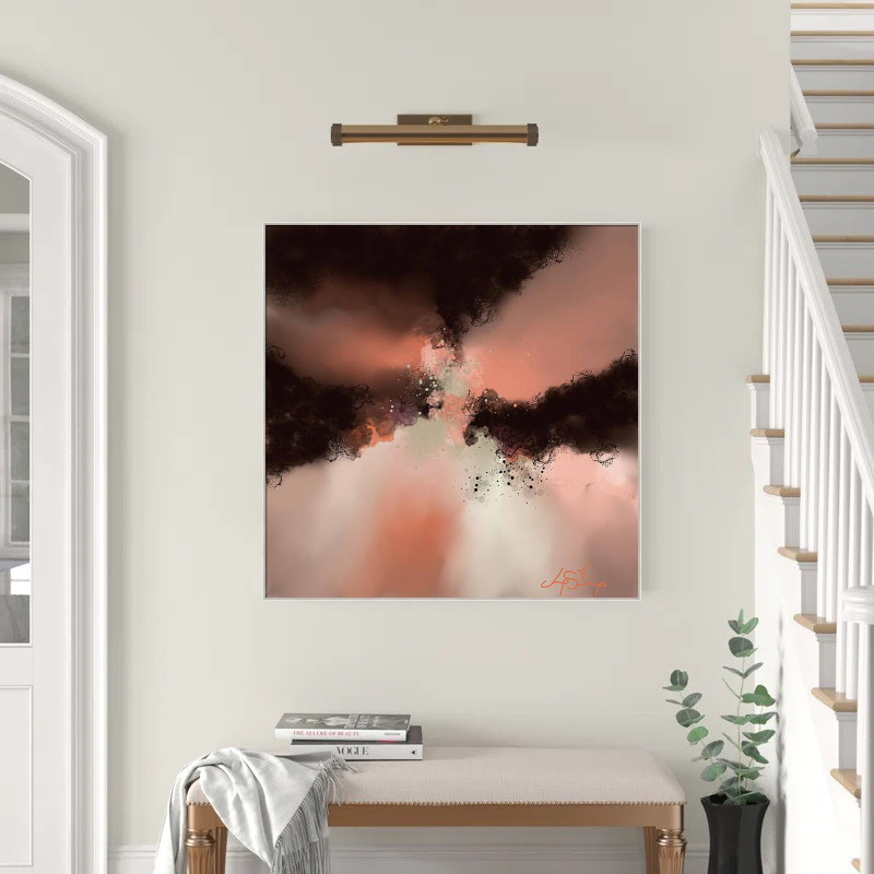 A swirling mix of dark and light tones creates a dramatic, cloud-like pattern across the canvas, blending shades of brown, pink, and white. Soft textures and splatters add an element of chaos and movement to the composition.