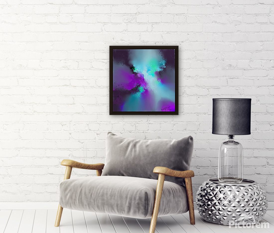 Vibrant swirls of purple, blue, and teal blend together, creating a dynamic and ethereal effect. Small white specks and darker areas add a sense of depth and movement within the composition.