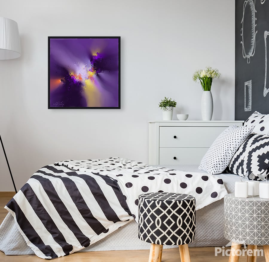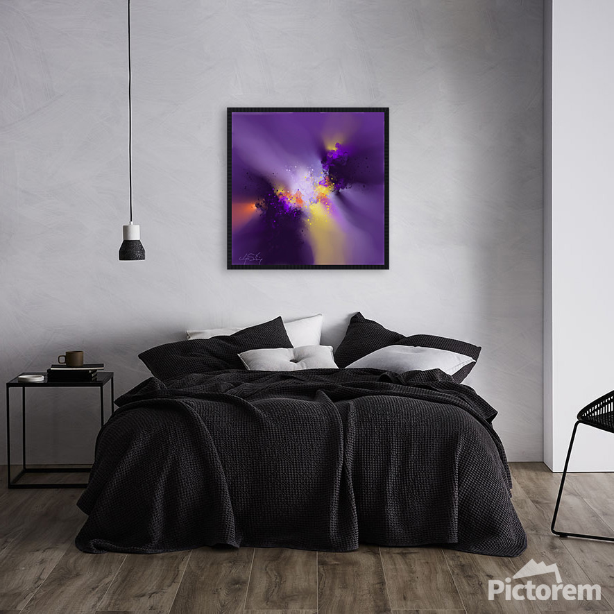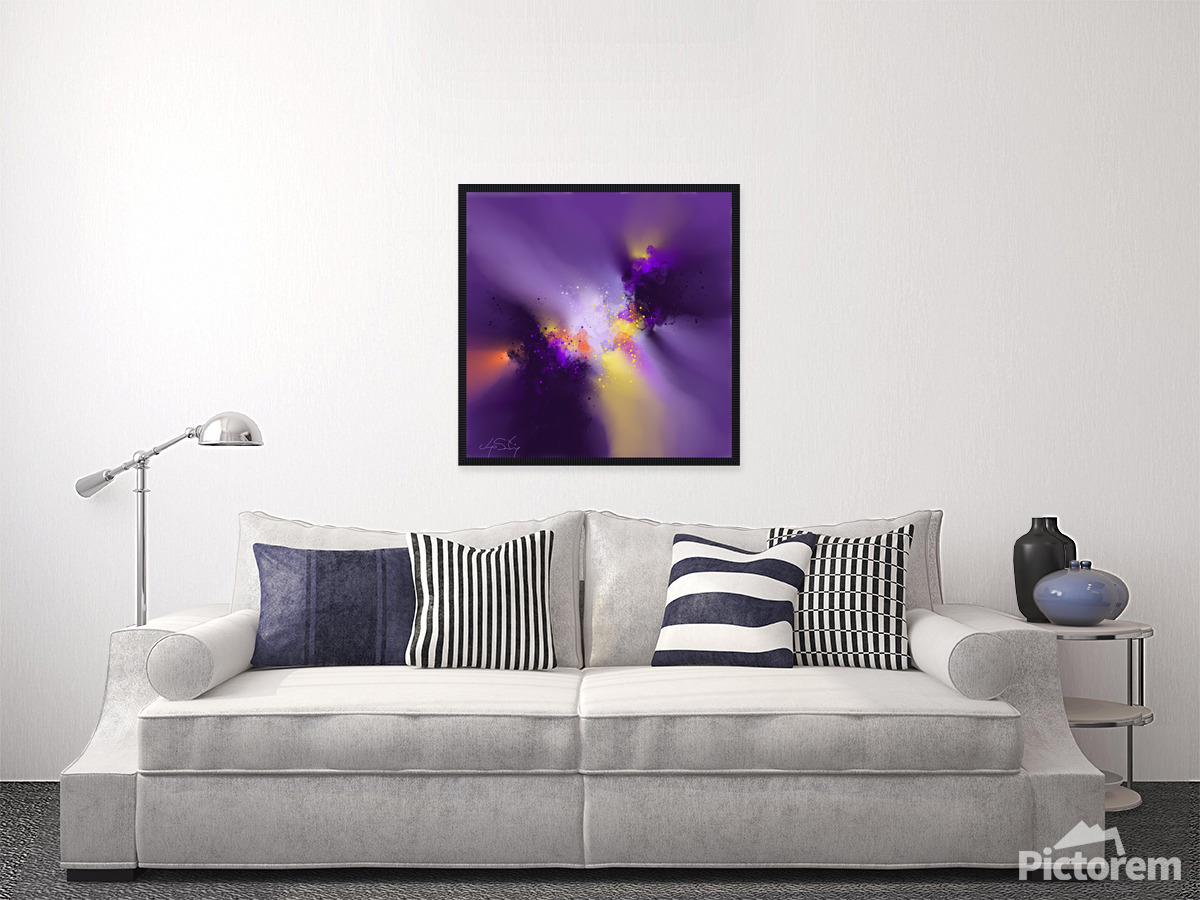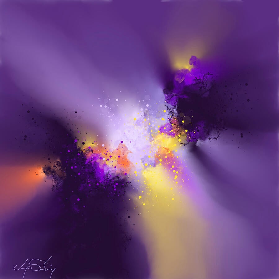 A vibrant explosion of colors blends purples, yellows, and blacks into a dynamic, swirling pattern. The energetic composition evokes a sense of celestial motion and cosmic wonder.