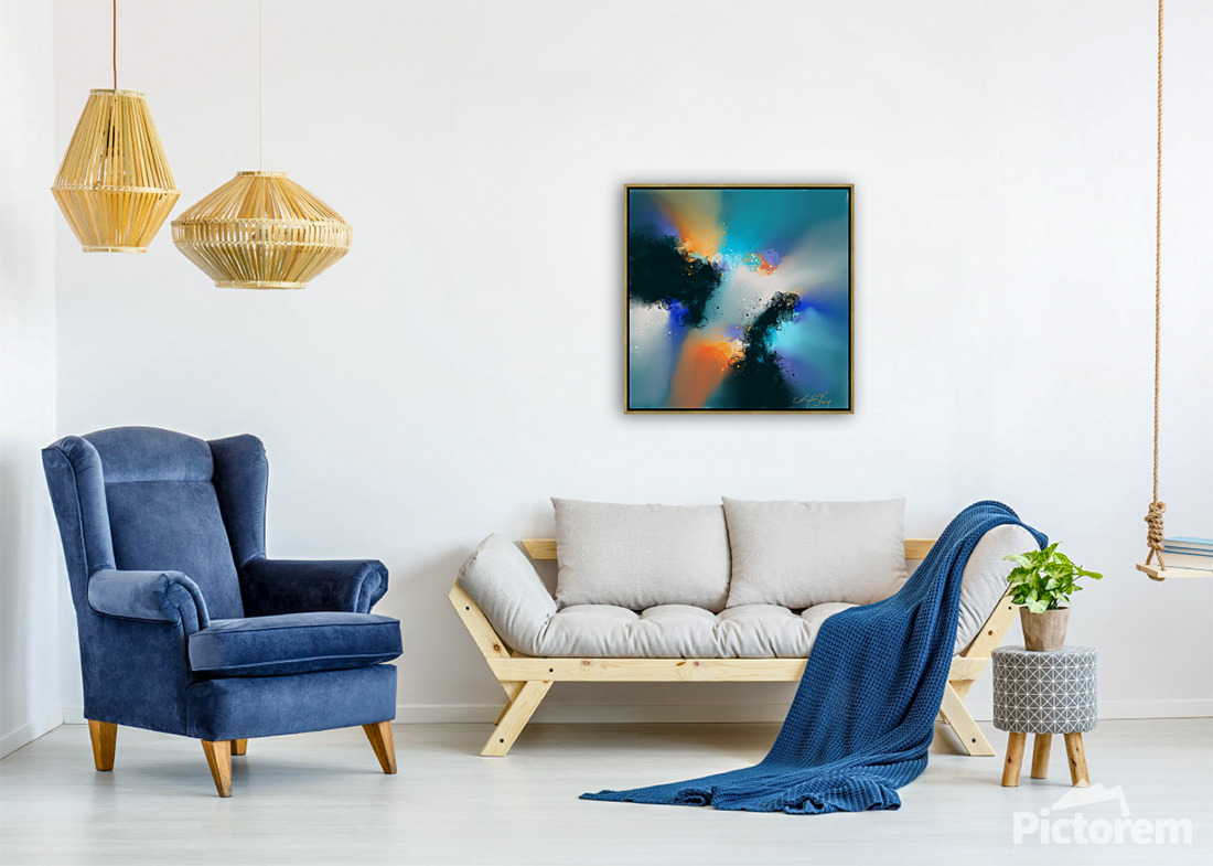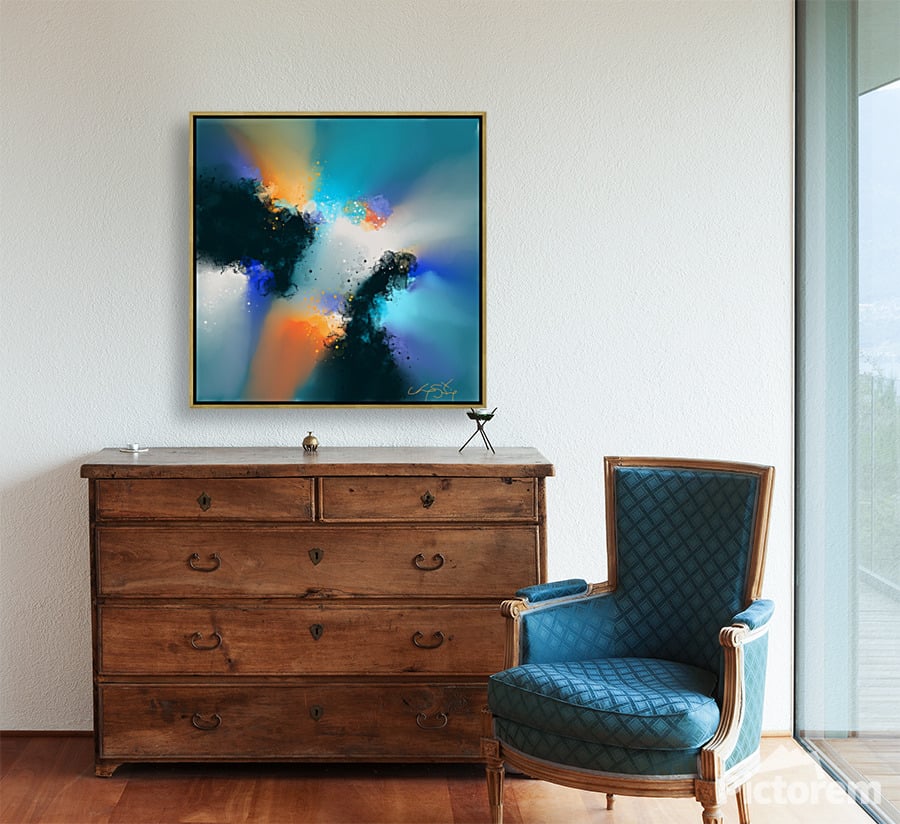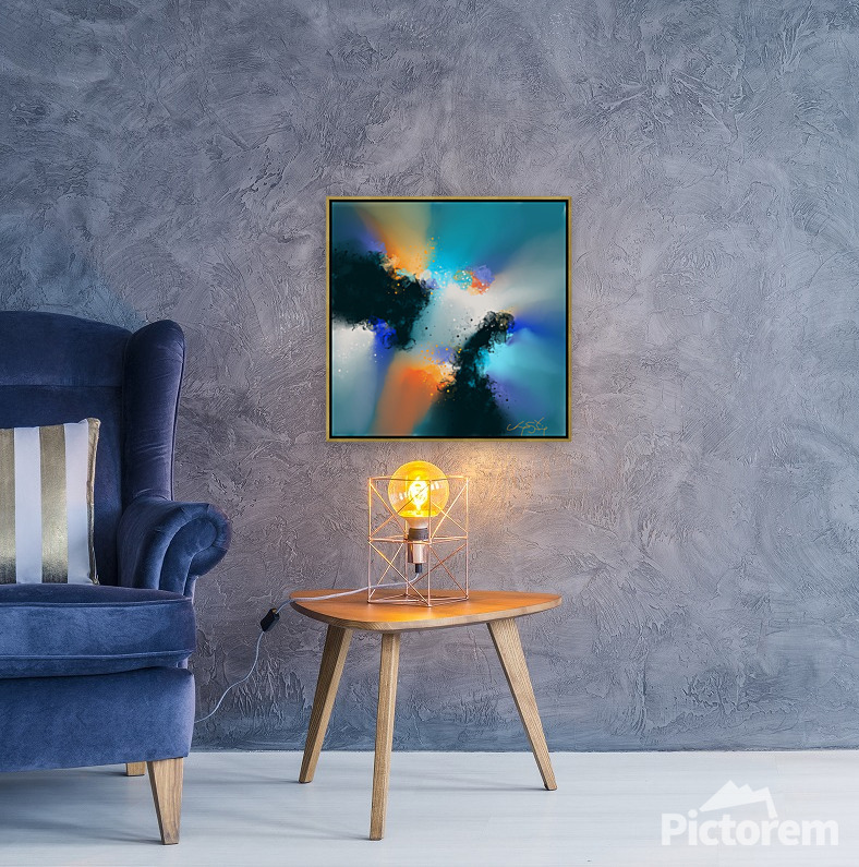 Vibrant splashes of aqua blue, orange, and white create a dynamic cosmic scene with swirling dark clouds. The composition suggests an energetic interplay of light and shadow, evoking a sense of movement and depth.