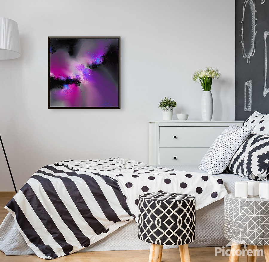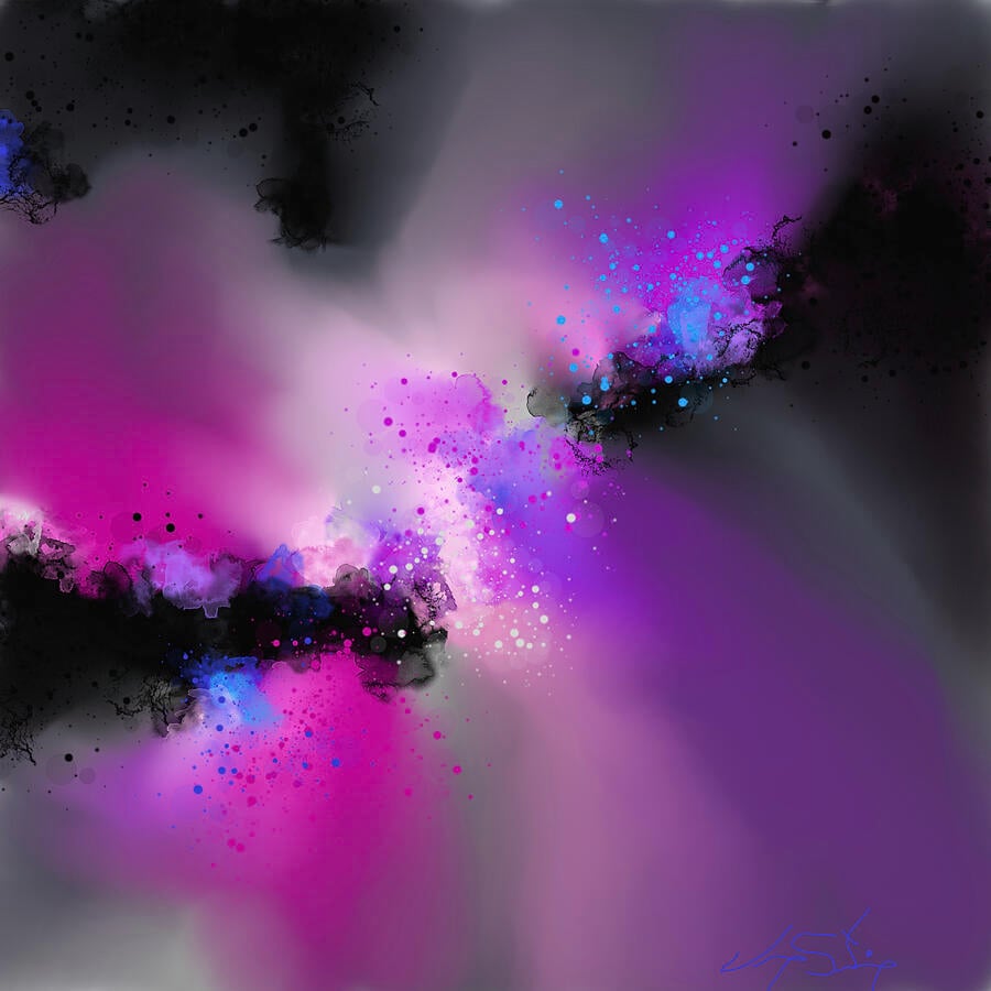 Vibrant splashes of purple, pink, and blue contrast against a dark background, creating a dynamic and ethereal atmosphere. The image evokes a sense of cosmic beauty with its nebula-like formations and scattered particles.