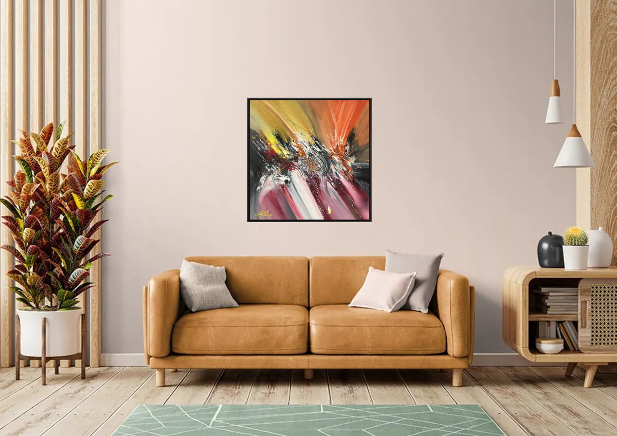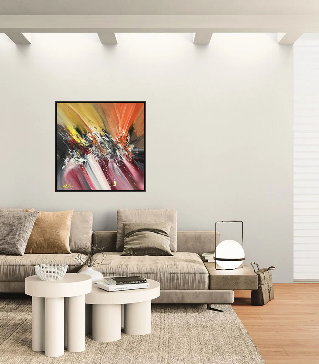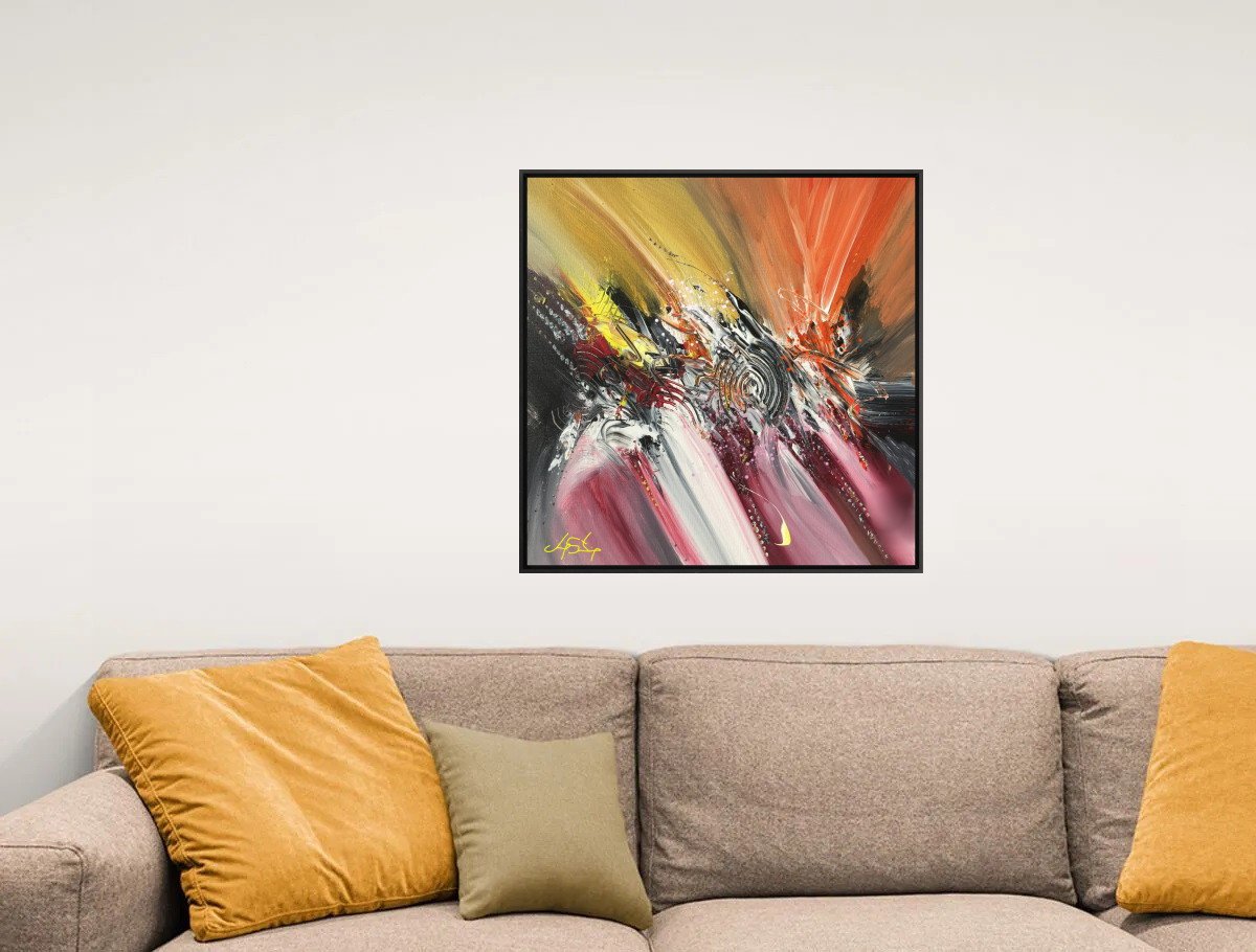 Vibrant swirls of orange, yellow, and pink collide with dynamic black and white strokes, creating a sense of energetic movement. The composition features circular patterns and splashes of color that evoke a feeling of controlled chaos.