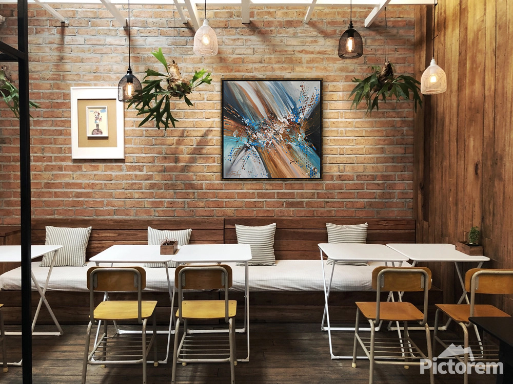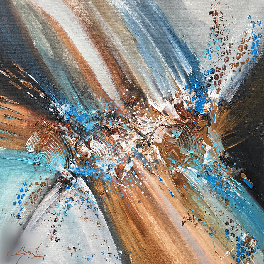 Bold strokes of blue, brown, and white converge with dynamic splatters and textures, creating a sense of movement and energy. Organic forms and abstract patterns suggest an interplay between chaos and harmony.
