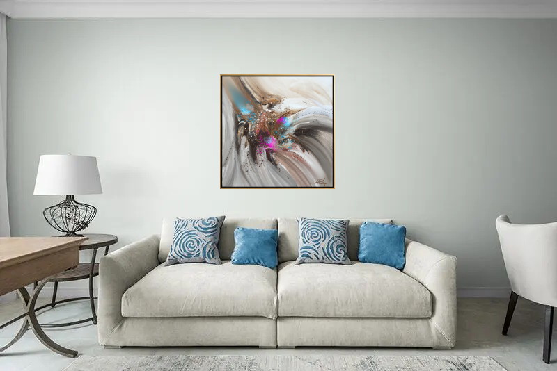 Dynamic swirls of beige, brown, and gray converge with splashes of vibrant blue and pink, creating a sense of movement and energy. Intricate patterns and dots add depth and contrast to the fluid composition.