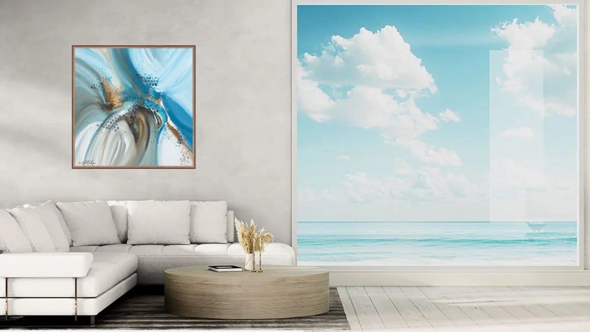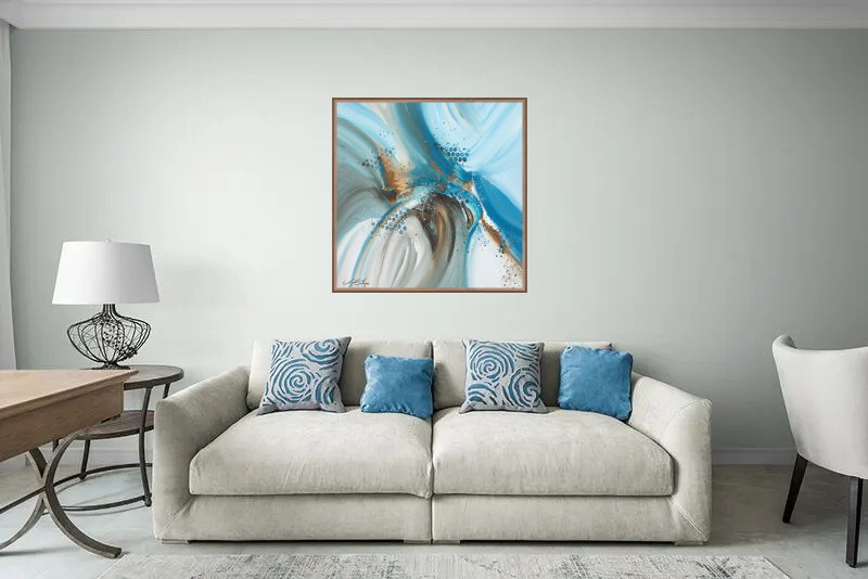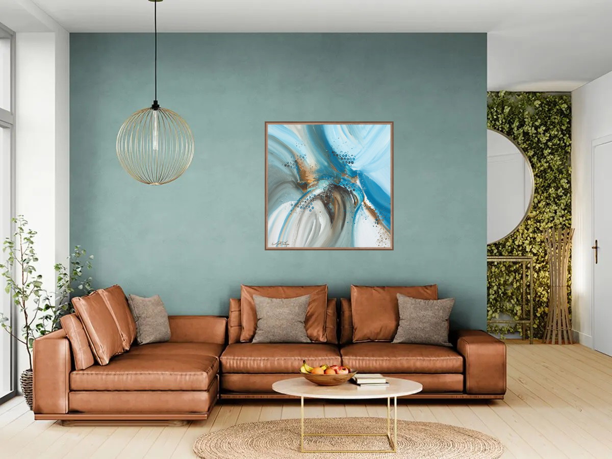 Swirling blue, brown, and beige tones blend into one another, creating a dynamic and fluid composition. Small clusters of dots add texture and contrast, enhancing the movement of the colors.