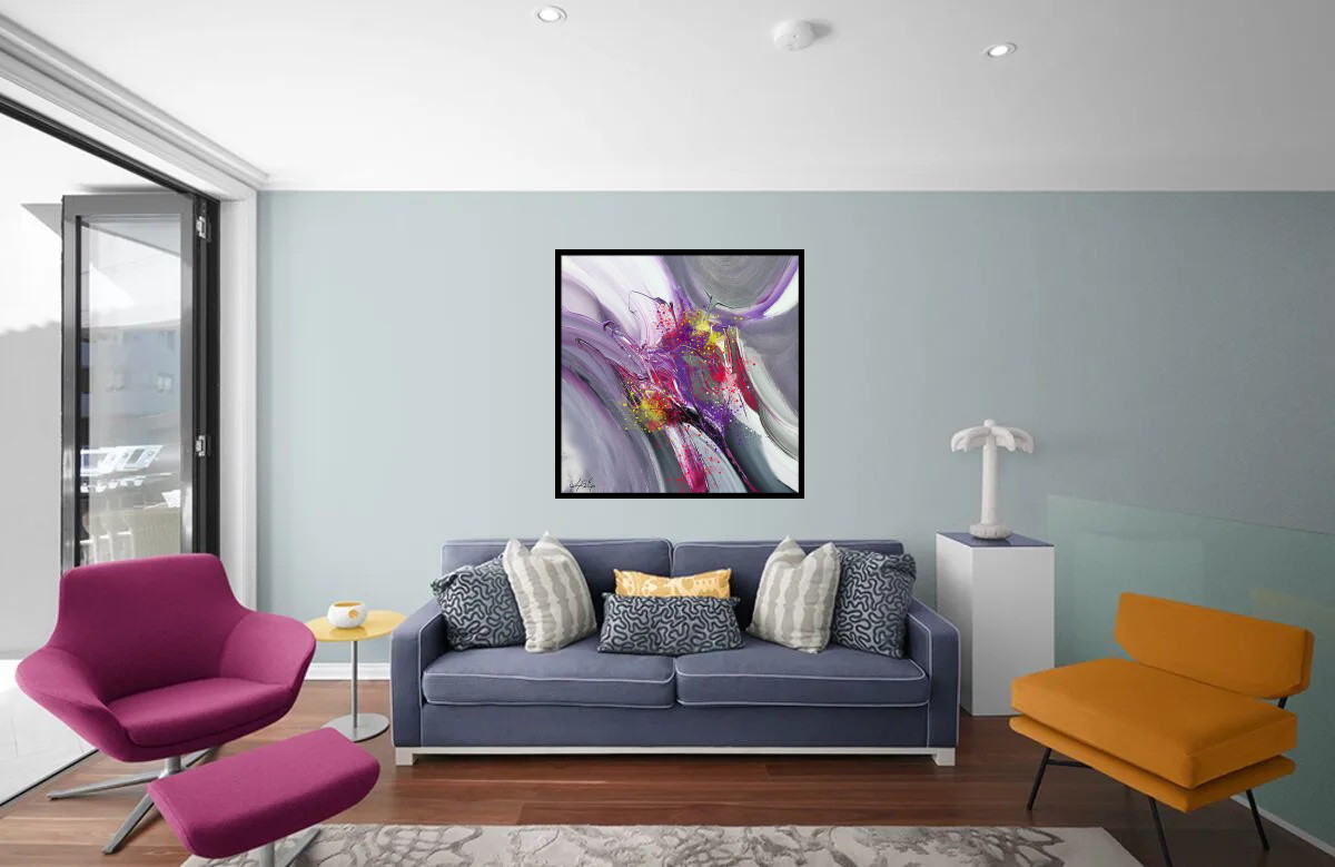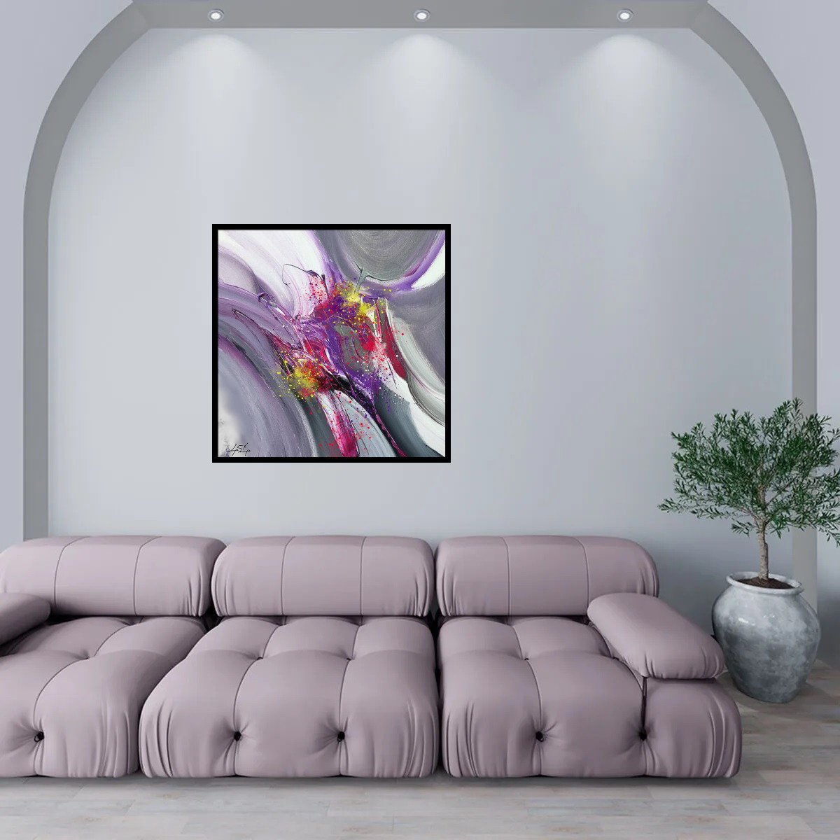A swirling fusion of purples, crimson reds, misty grays, and chalky whites tumble across the canvas in bold, impulsive strokes—like a storm captured mid-motion. Energetic ribbons twist and collide at the heart of the composition, creating a vortex of layered color and texture. Each brushstroke carries intention, suggesting emotional turbulence softened by moments of serenity. The outer regions dissolve into gentle transitions, giving the piece both structure and freedom. Signed in the lower left by the artist Joey Santiago, the work radiates a sense of passion and movement—an abstract symphony of color, rhythm, and emotion.