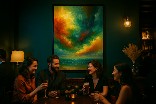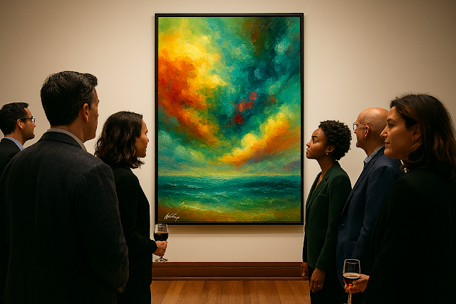 A symphony of color and motion, Tempest Serenade evokes the raw beauty of nature’s emotional extremes. The painting’s swirling sky—alive with fiery oranges, molten reds, and electric blues—rises above a tranquil sea rendered in layered strokes of teal and turquoise. The horizon line divides chaos from calm, yet the brushwork suggests they are in dialogue, not opposition.