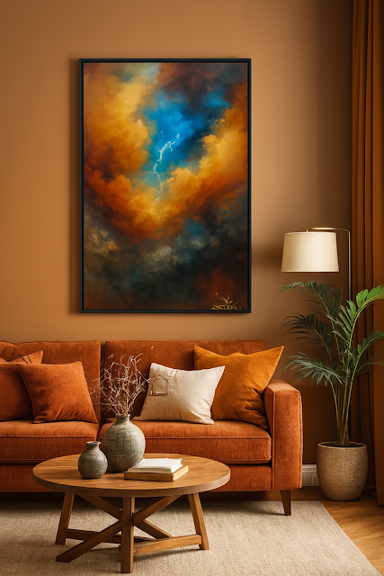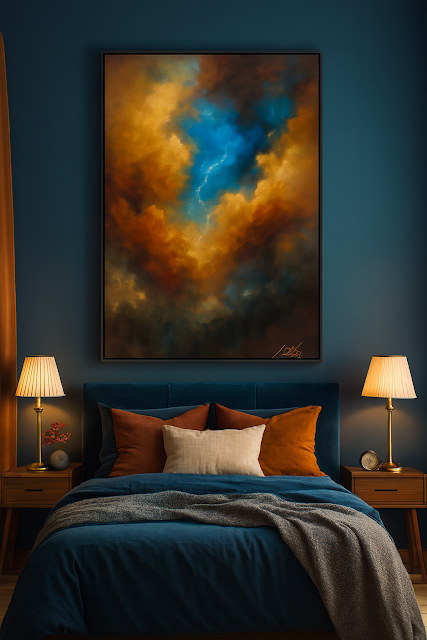 A visceral portrayal of nature’s fury and beauty, Eye of The Storm captures the precise moment when chaos converges into clarity. Swirling clouds in molten hues of orange, brown, and deep gray spiral around a piercing bolt of lightning, striking through a luminous blue sky. The composition balances tension and serenity, with expressive brushwork that lends movement and depth to the scene.