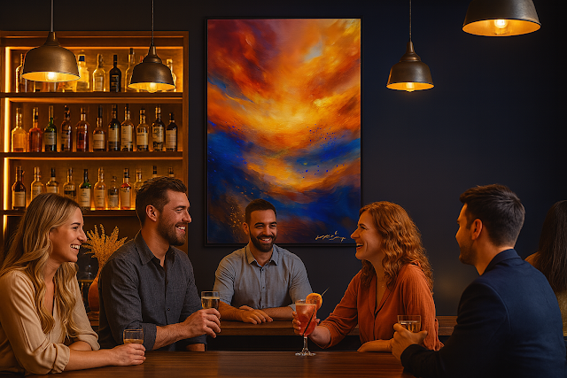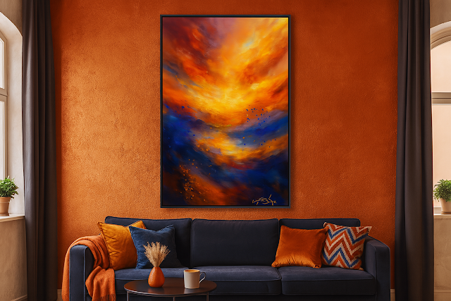 A storm of color unfolds—where molten skies descend into shadowed depths, and silence flickers beneath the blaze. Fluid brushstrokes carry the weight of memory, scattering luminous fragments like whispers across a fractured horizon. This piece invites the viewer to linger in the tension between eruption and stillness, where each dot pulses with the residue of something once felt, now fading. It is a meditation on transformation, on the beauty of what remains after the fire.