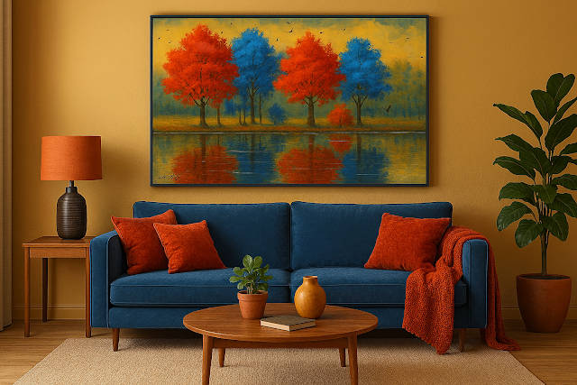 A vivid meditation on contrast and harmony, Between Fire and Frost captures the delicate tension between warmth and stillness. Fiery red trees blaze against a backdrop of cool blue foliage, each reflected in the tranquil waters below. The composition evokes the fleeting beauty of seasonal change—where autumn’s passion meets winter’s calm, and nature pauses in perfect equilibrium.