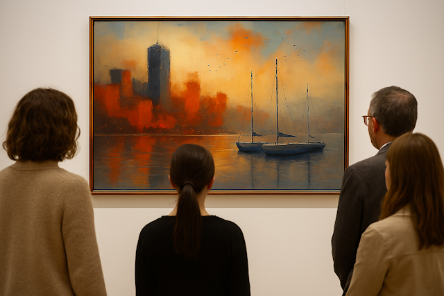 A luminous cityscape unfolds across the canvas, where the tranquil waters of Ember Bay mirror the fiery hues of a setting sun. Two sailboats rest quietly in the foreground, their masts slicing through the warm glow as reflections ripple beneath them. The skyline rises behind in dramatic contrast—towering buildings bathed in molten orange and crimson, anchored by a single dark monolith that commands the horizon. A flock of birds drifts across the sky, adding motion to the stillness and hinting at unseen stories beyond the frame.