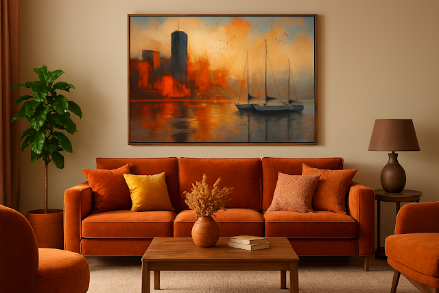 This piece evokes a moment suspended between serenity and intensity, where nature and architecture converge in a palette of ember, gold, and steel blue. It invites viewers to linger in the quiet tension of dusk, where every reflection carries the weight of memory and possibility.