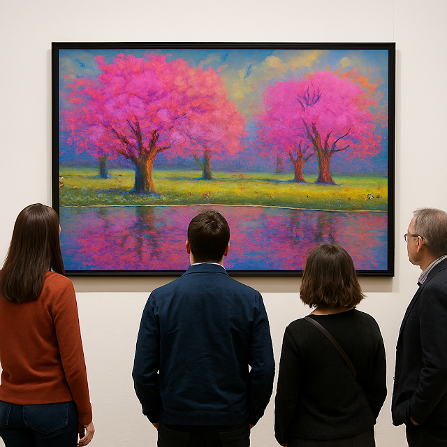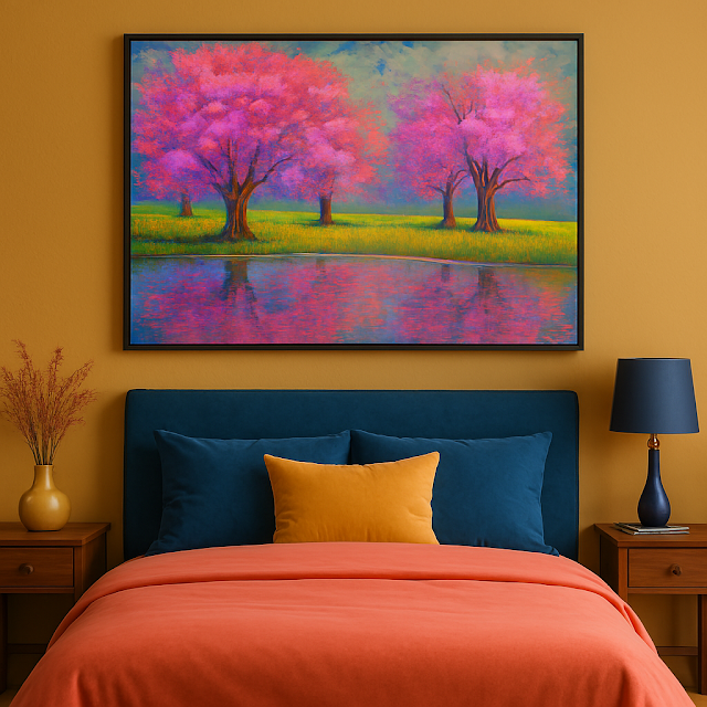 A symphony of spring unfolds in this impressionistic landscape, where blooming cherry blossoms shimmer in hues of pink, crimson, and violet. Their delicate forms stretch skyward, mirrored in the still waters below, creating a dreamlike duality. The golden sky—caught between sunrise and memory—casts a gentle glow across the meadow, where red and yellow wildflowers whisper in the breeze. Birds drift silently overhead, adding motion to the stillness, presence to the peace. This piece invites quiet reflection, evoking the fleeting beauty of light, nature, and time suspended.