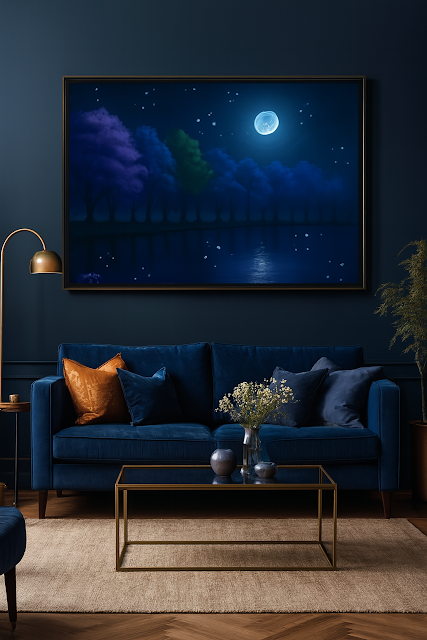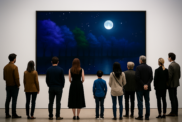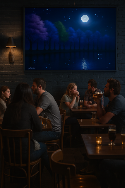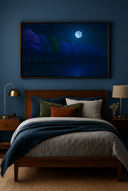 A moonlit hush settles over a mirrored lake, where trees stand like silent sentinels in shades of violet, indigo, and emerald. Two green figures break the rhythm—witnesses to something unspoken—while snowflakes drift like forgotten memories across the deep blue sky. The full moon, luminous and unwavering, casts a soft glow that blurs the line between reflection and reality. This piece invites the viewer into a moment suspended in time, where color becomes emotion and silence speaks volumes.