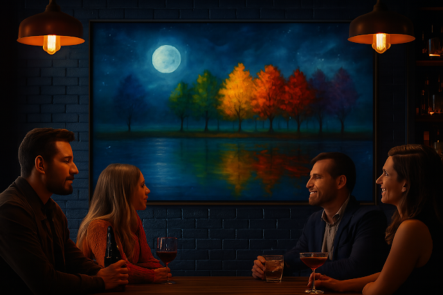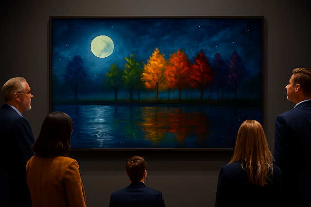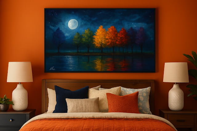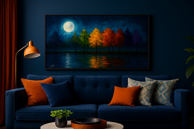 A radiant moon casts its glow over a tranquil body of water, illuminating a row of trees whose foliage transitions through a full chromatic spectrum—from verdant green to golden yellow, fiery orange, deep crimson, and violet dusk. The night sky, rich with stars and swirling clouds, envelops the scene in serenity, while the water below mirrors the vibrant gradient with gentle distortion. Lunar Spectrum invites viewers into a dreamlike moment where color, light, and reflection converge. It evokes themes of emotional transformation, seasonal passage, and the quiet magic of moonlit solitude.