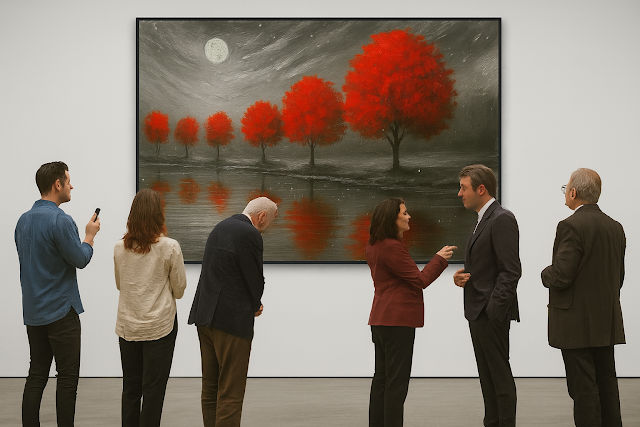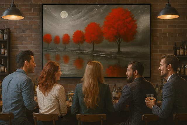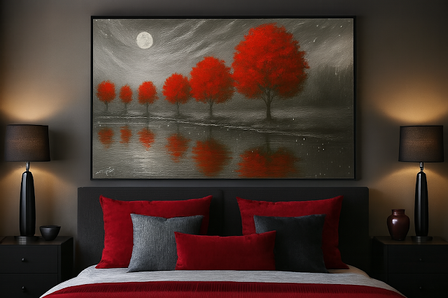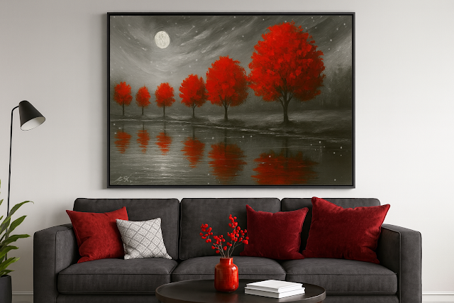 A hush falls over the landscape as six crimson trees stand sentinel beside a moonlit lake, their reflections rippling softly in the still water. The sky, heavy with swirling clouds and falling snow, glows under the watchful eye of a full moon—its light casting a silvery veil across the grayscale forest beyond. Each tree burns with quiet intensity, a vivid contrast against the subdued palette, evoking memory, longing, and the passage of time. The scene is both haunting and serene, inviting the viewer to pause, reflect, and listen to the whispers carried on the winter wind.