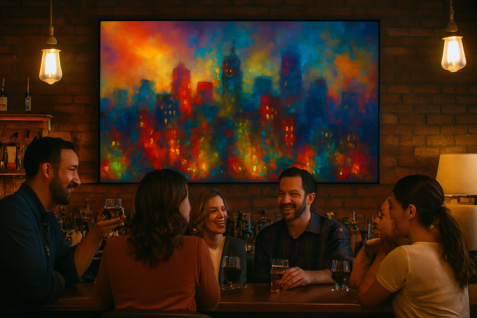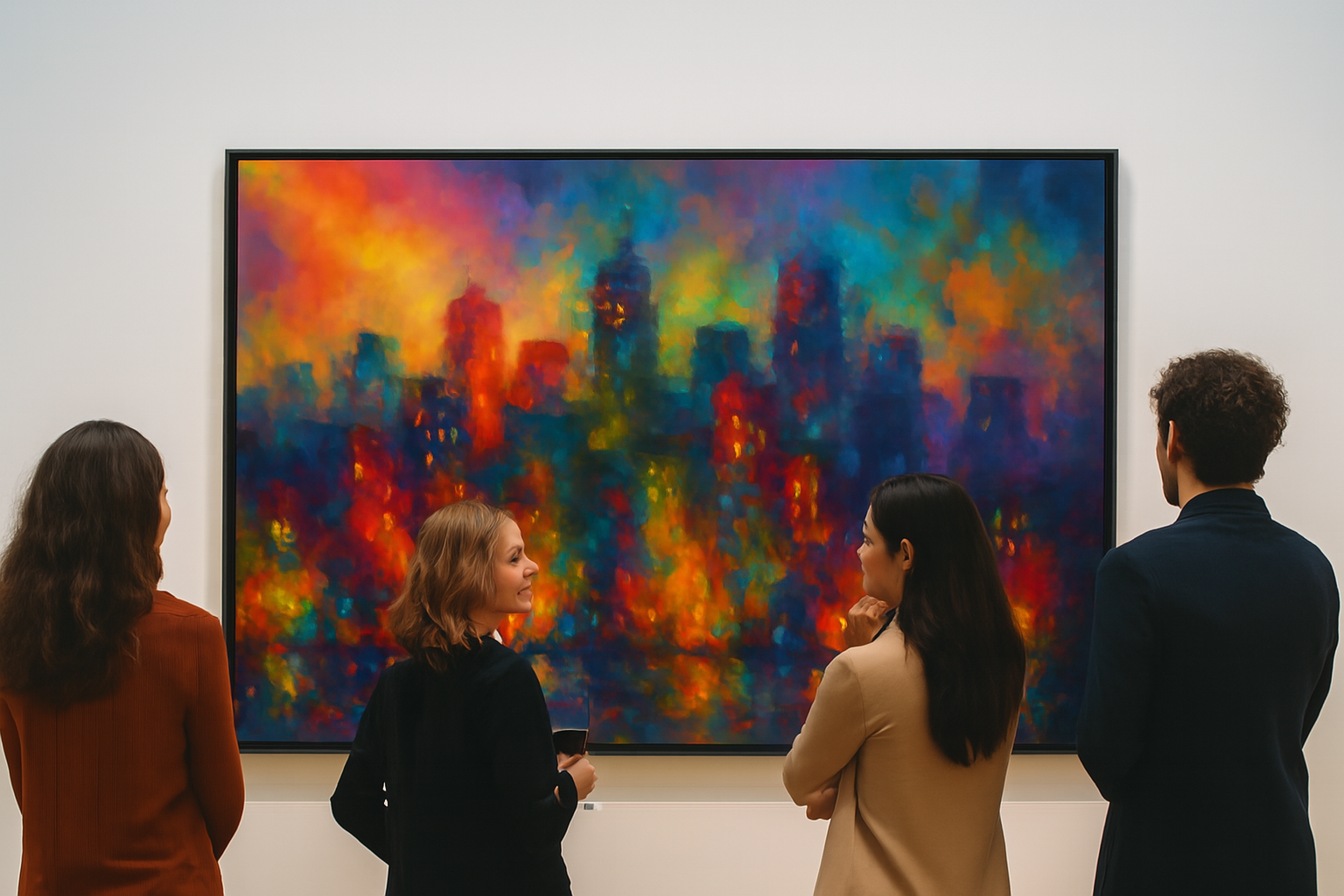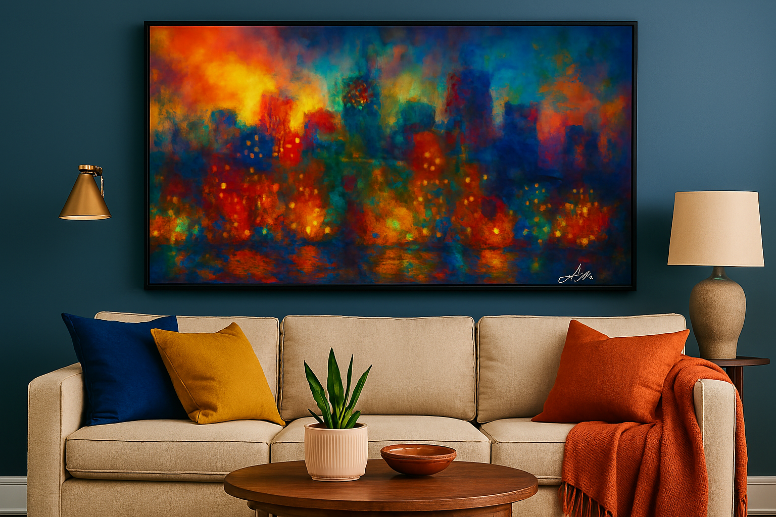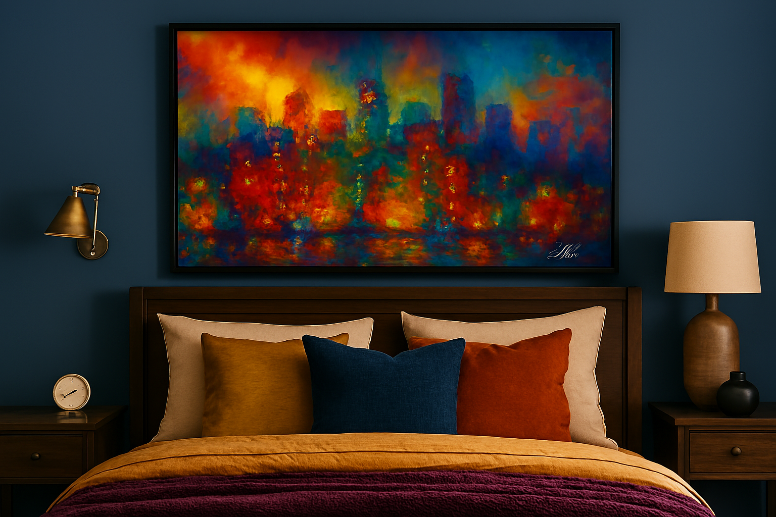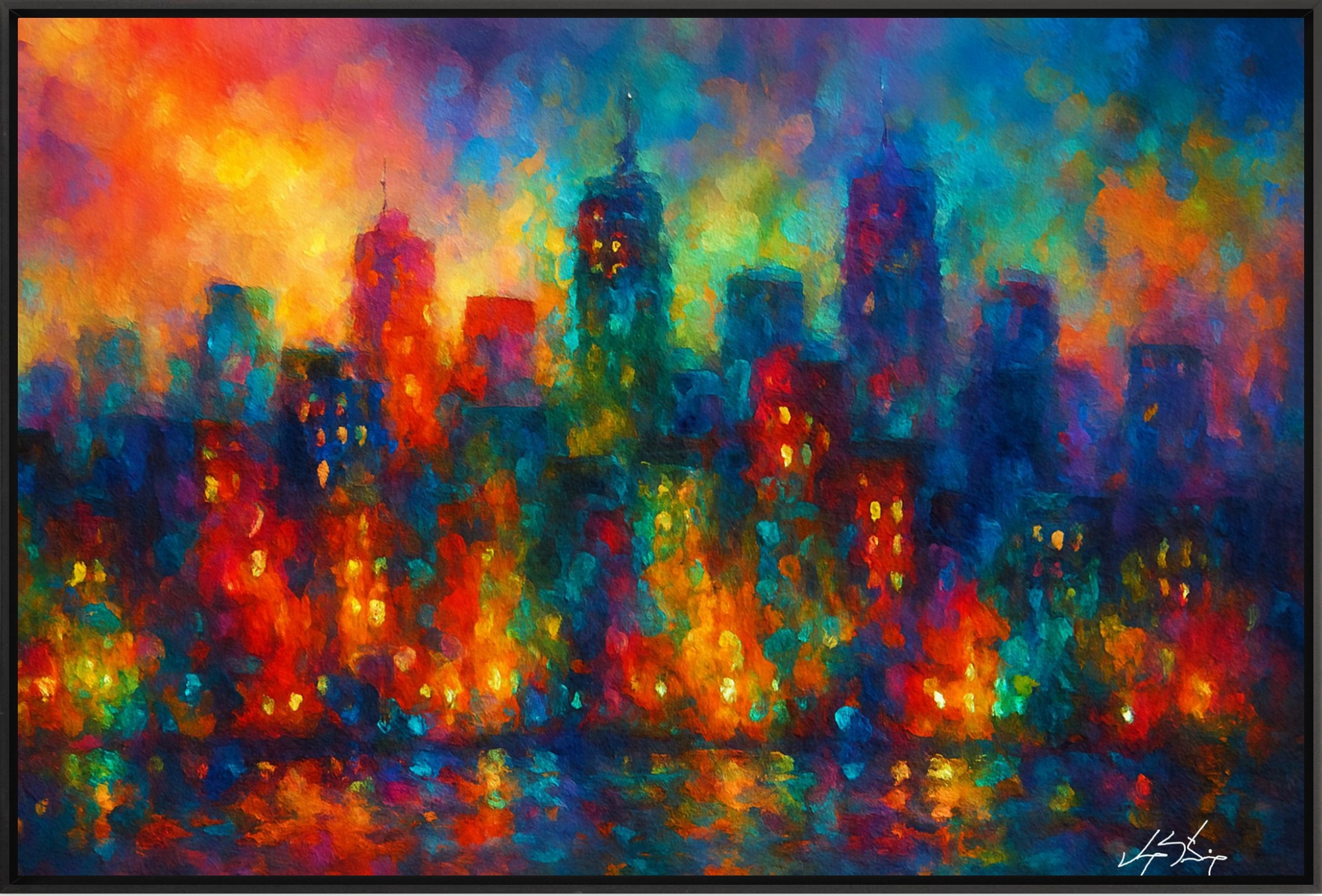 A symphony of light and motion, City of Echoes captures the pulse of an urban nightscape through a kaleidoscope of color. Abstract towers rise like memories in motion, their glowing windows flickering with stories untold. Reflections ripple across the water below, blurring the line between reality and reverie. With impressionistic brushwork and a palette that dances from fiery reds to tranquil blues, the piece evokes both the chaos and calm of city life. It’s a portrait of connection—where every light is a voice, and every echo a heartbeat.