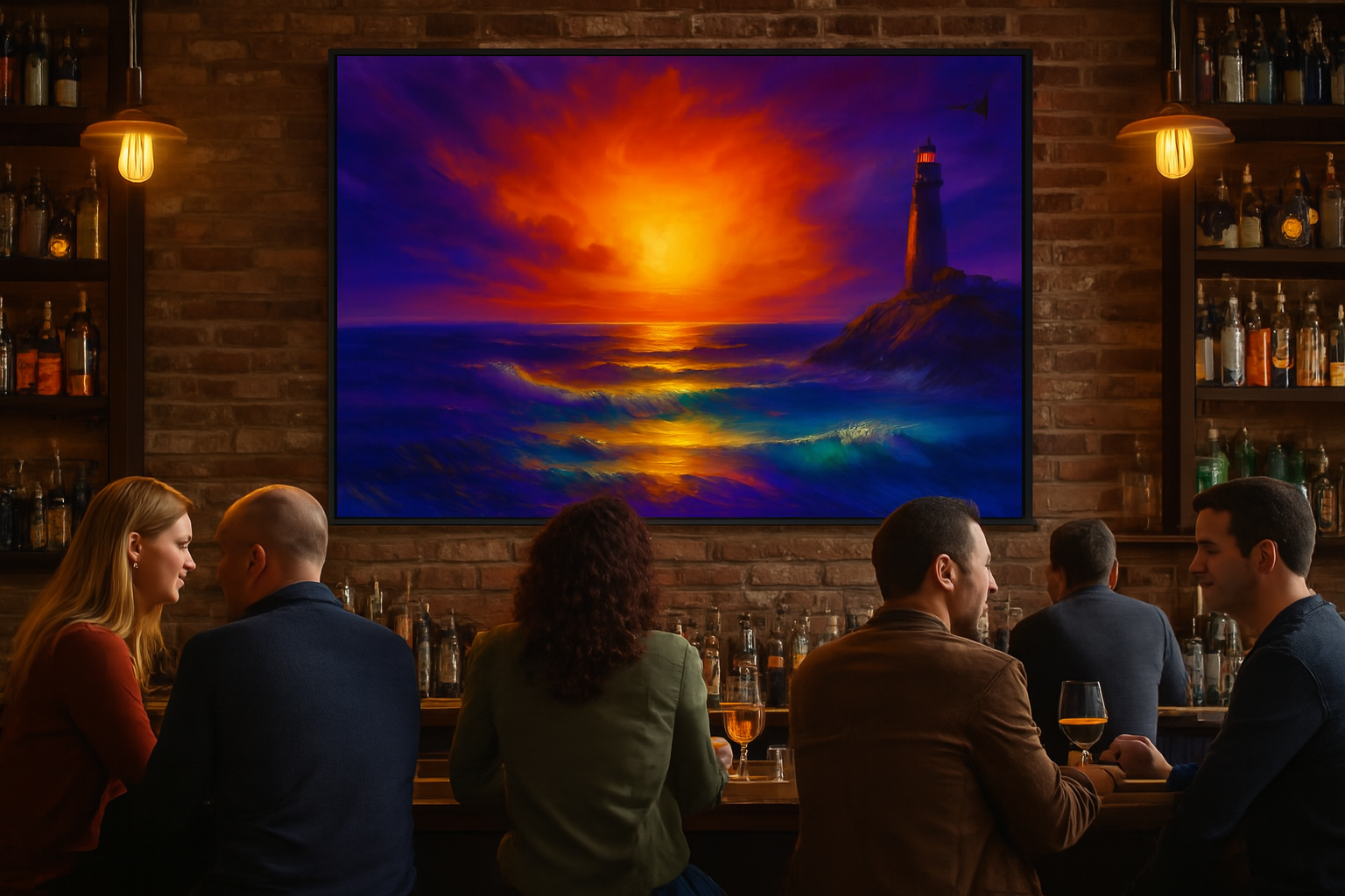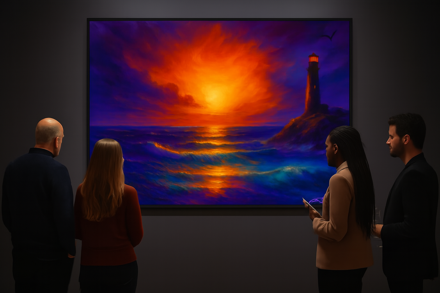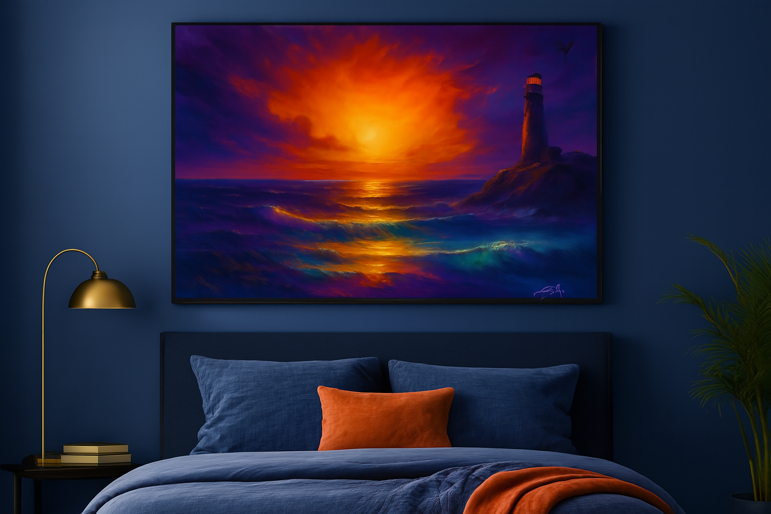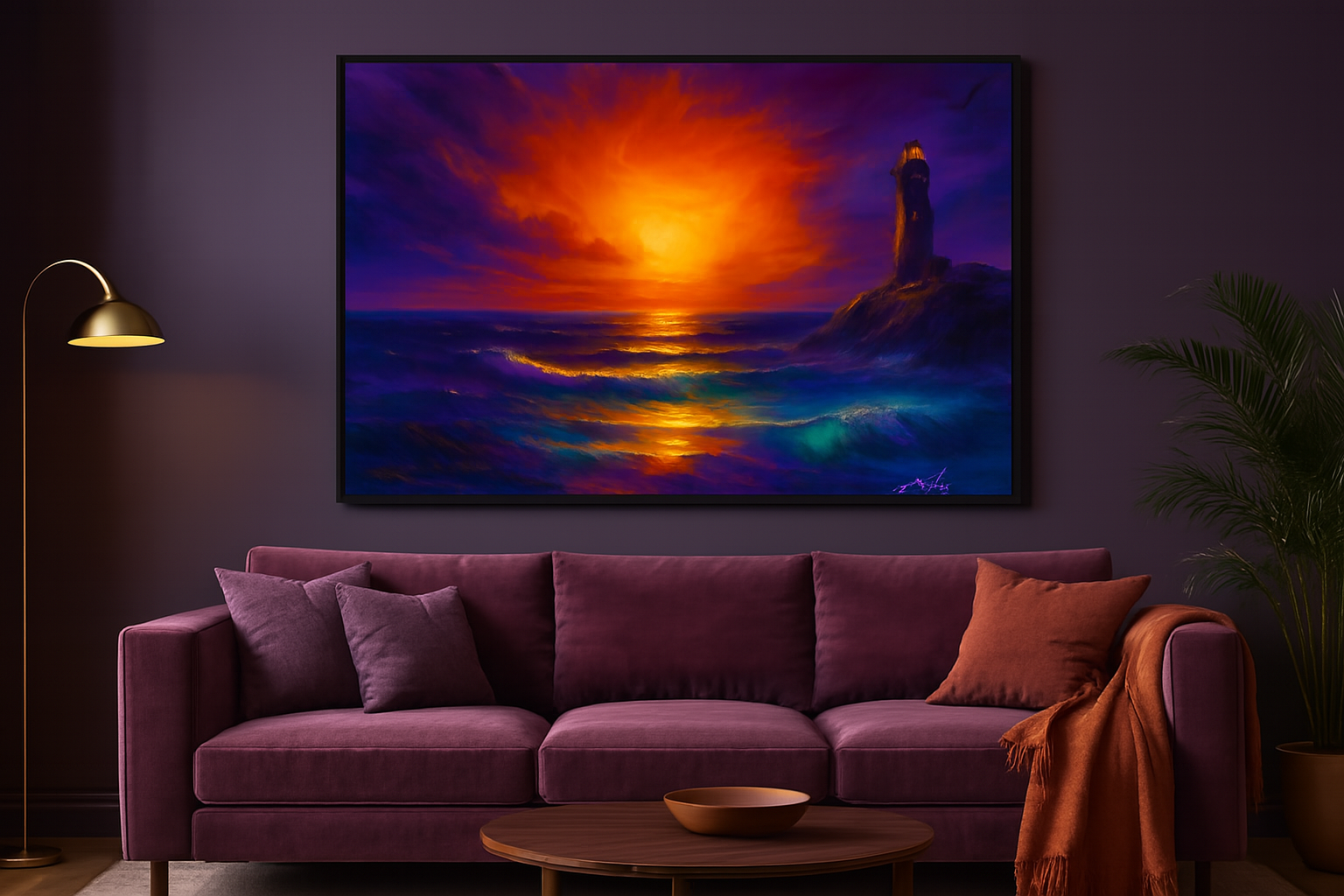 A solitary lighthouse stands sentinel on a rocky cliff, bathed in the final blaze of a setting sun. The sky erupts in a symphony of orange, crimson, and violet, mirrored by the restless ocean below. Waves crash in textured rhythm, their crests catching fire in the sun’s reflection, while cooler tones recede into the horizon. The painting captures a moment suspended between chaos and calm—where light meets shadow, and solitude becomes sanctuary.