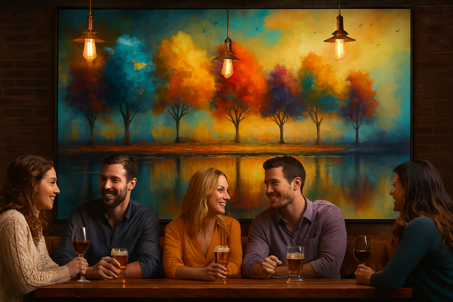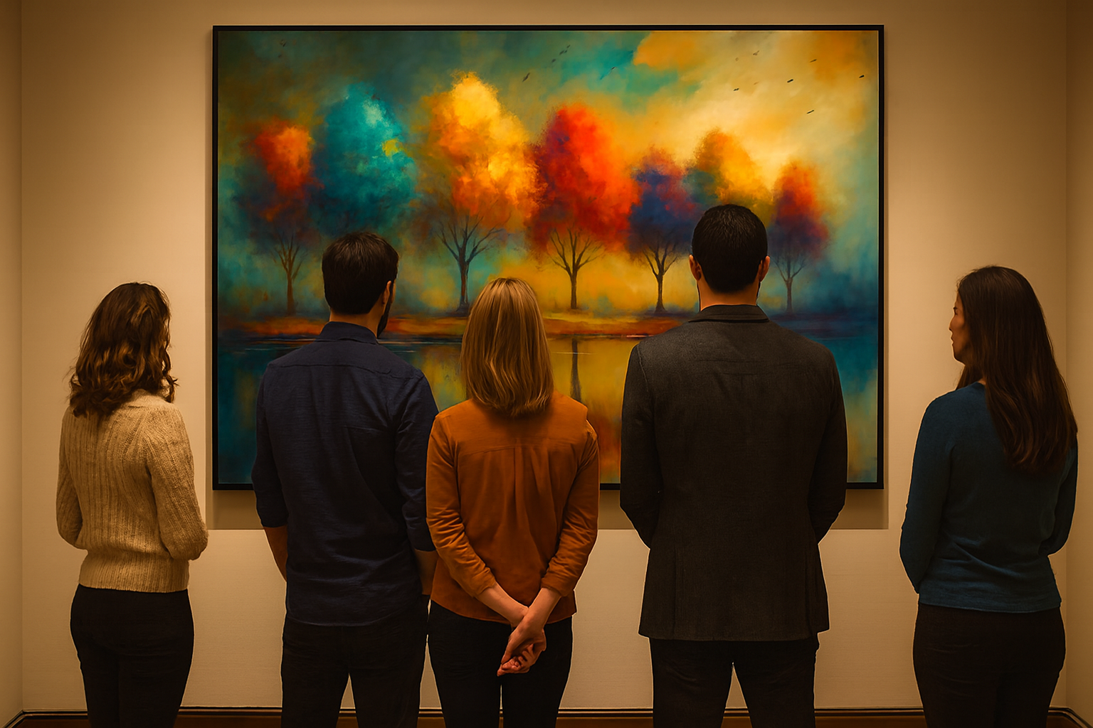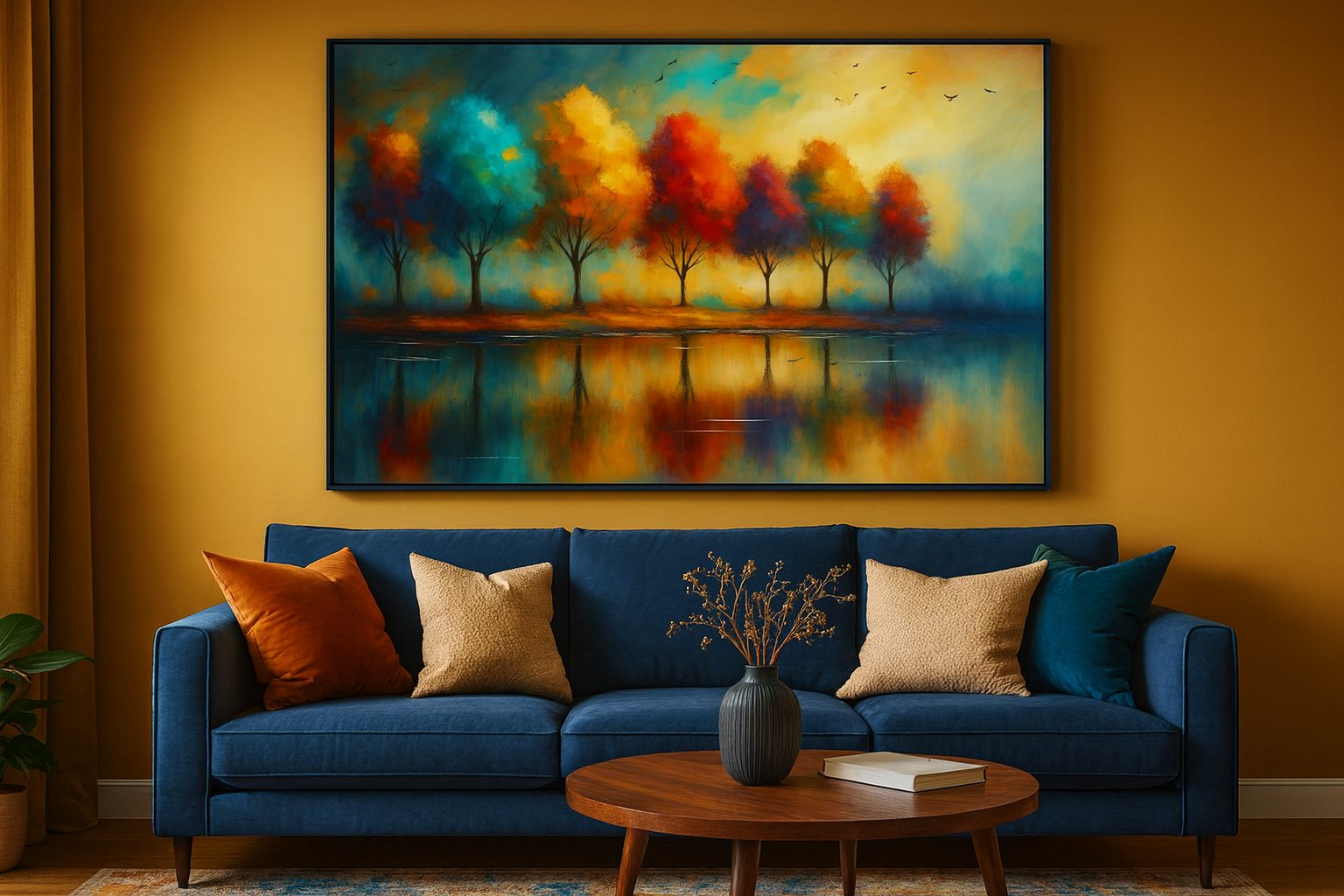 Immerse yourself in the radiant beauty of Rainbow Reflections: Vibrant Trees at Sunset, a captivating impressionist landscape that celebrates nature’s full spectrum. This artwork features a row of vividly colored trees—blue, teal, yellow, orange, red, purple, and pink—standing along a tranquil shoreline, their reflections shimmering in the water below. The sky glows with a harmonious blend of sunset hues, while birds soar overhead, adding movement to the serene scene.