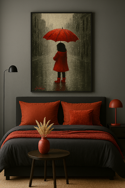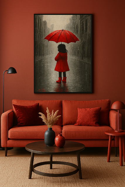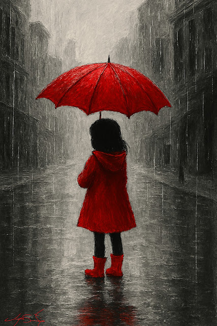 A solitary figure stands in the middle of a rain-soaked street, shielded by a bright red umbrella. The vibrant red coat, matching the umbrella and boots, contrasts starkly with the grayscale background, drawing the viewer’s focus. The scene evokes a sense of solitude and reflection amidst the urban rain.