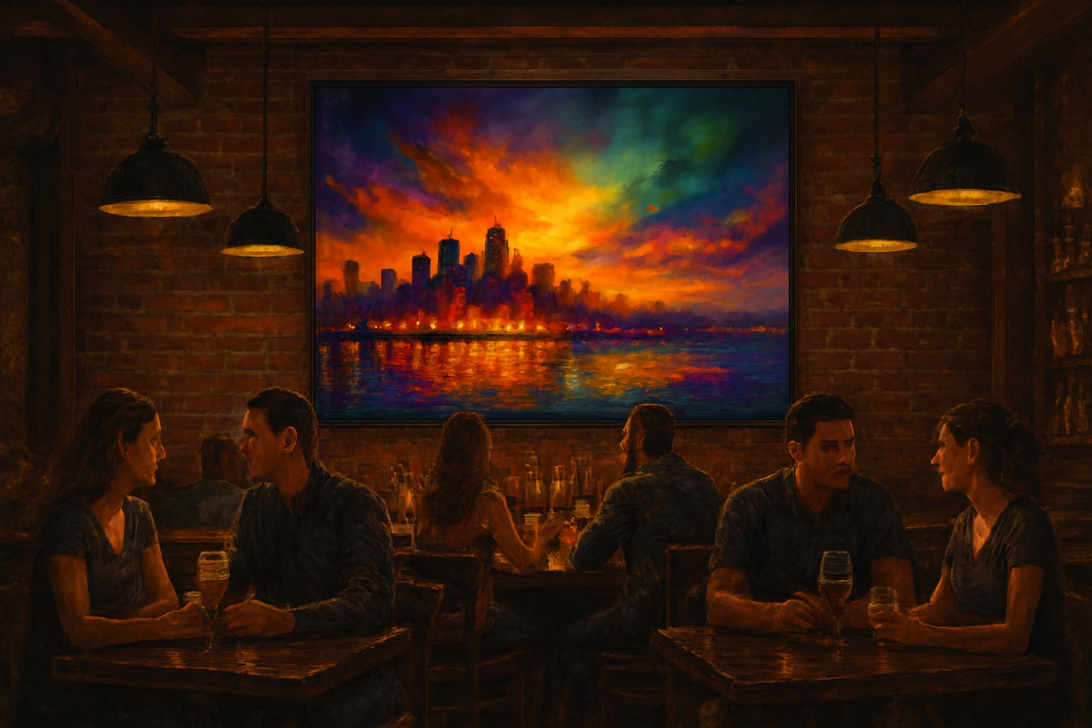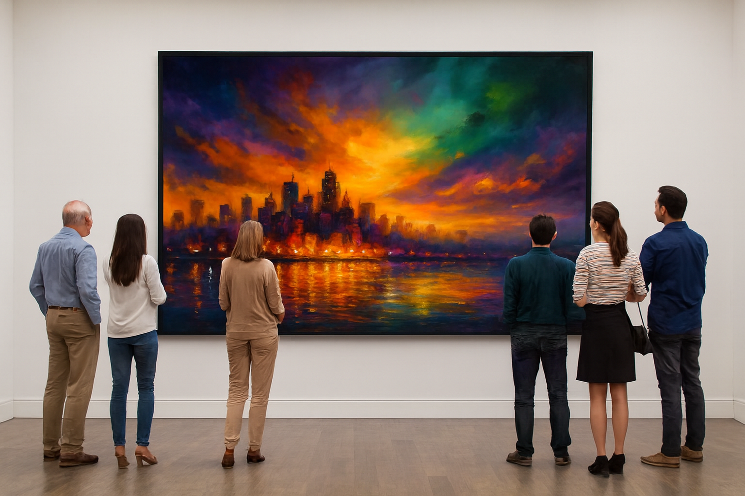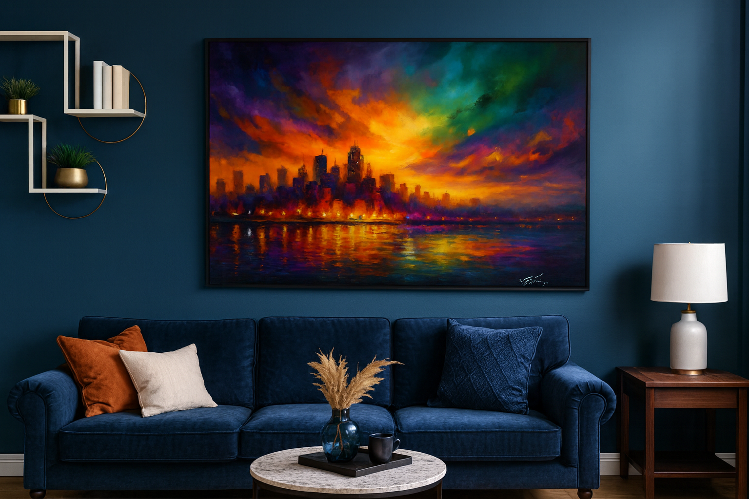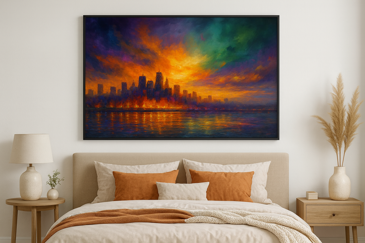 "Colorstorm Metropolis: Abstract Skyline at Dusk" captures the breathtaking beauty of a modern city skyline illuminated by a dramatic sunset. Bold brushstrokes and vibrant hues of orange, purple, and green swirl across the sky, reflecting brilliantly on the water below. This abstract cityscape painting evokes energy, romance, and cosmic wonder, making it a striking centerpiece for any home or office. Perfect for lovers of urban art, abstract cityscapes, skyline wall décor, and sunset paintings, this piece brings movement, light, and atmosphere into your space.