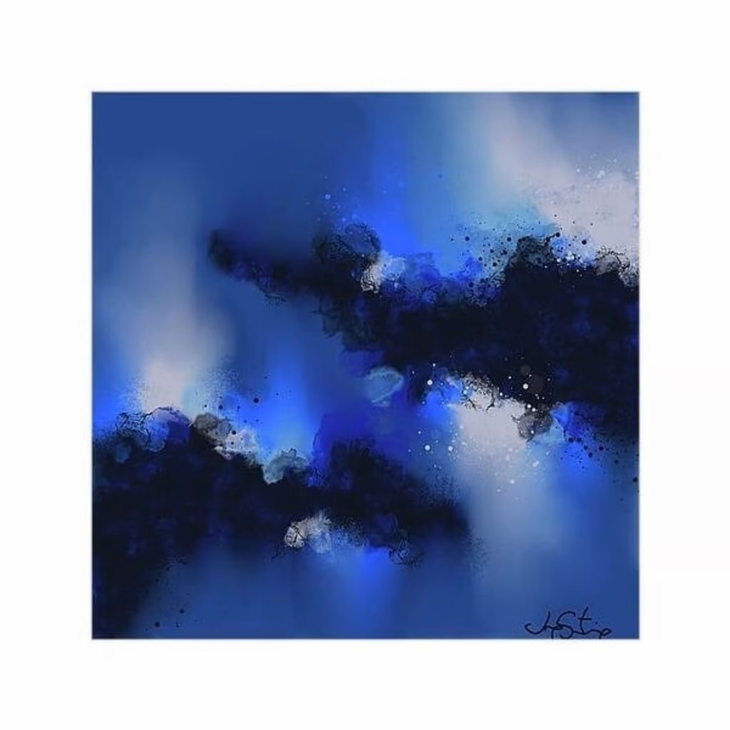 Blue and black hues blend together in an abstract pattern, with hints of light creating a sense of depth and contrast. Dark patches resembling clouds and splashes of white add a dynamic quality to the composition. The dimensions of the art print is 12 X 12 and includes a white mat.
