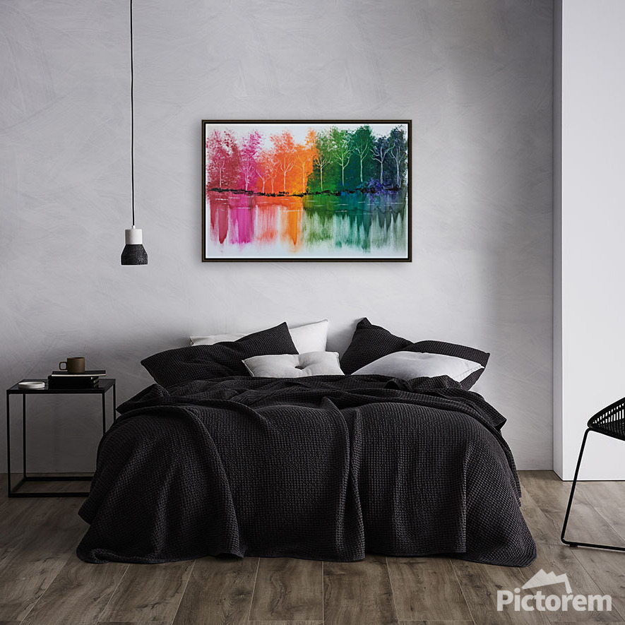 Immerse yourself in a vibrant forest of colors with the Lake Jubilation Art Print. This captivating piece brings to life a majestic scene of multi-colored trees that dance with joy across the canvas. Let the hues of nature's palette fill your space with a sense of jubilation and wonder, inviting you to get lost in the beauty of this enchanting artwork.