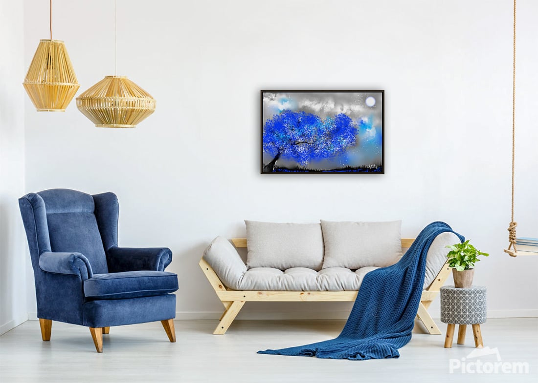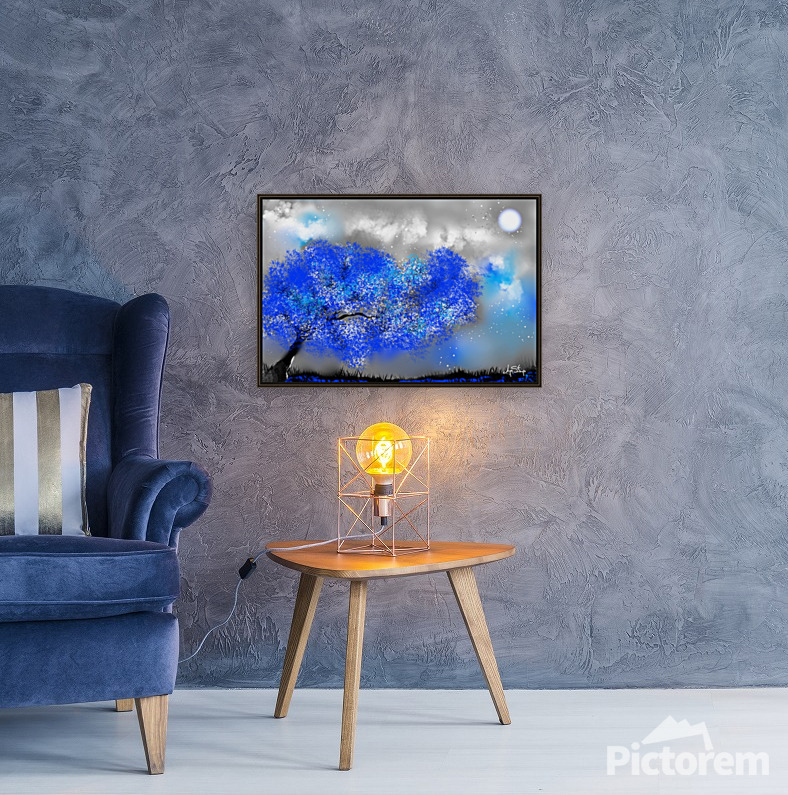 A tree with vibrant blue leaves stands against a dreamy backdrop of a cloudy night sky and a glowing moon. Small white dots scattered throughout the scene suggest a gentle snowfall or ethereal stars.
