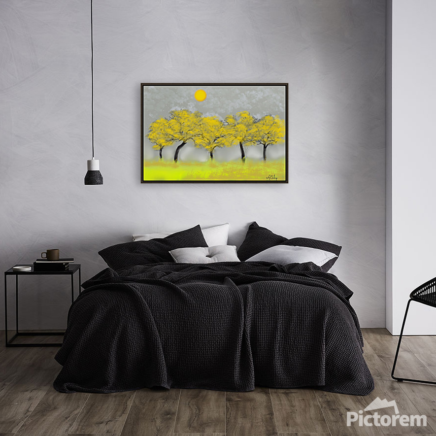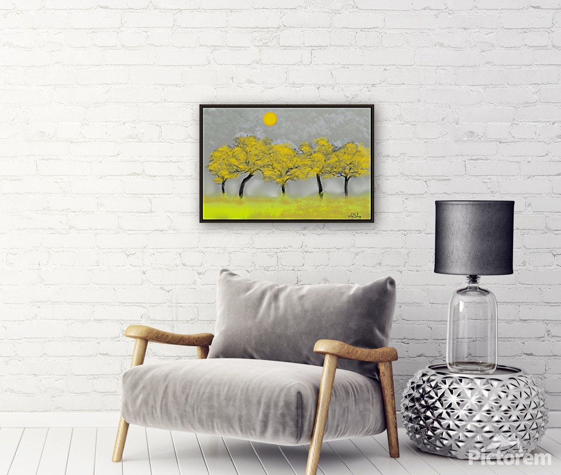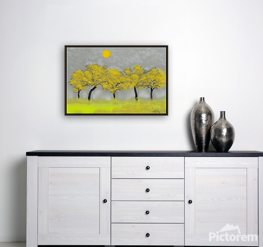 A row of trees with vibrant yellow foliage stands against a soft, gray background, creating a serene landscape. A glowing yellow sun hovers in the sky, with gentle clouds adding depth to the scene.