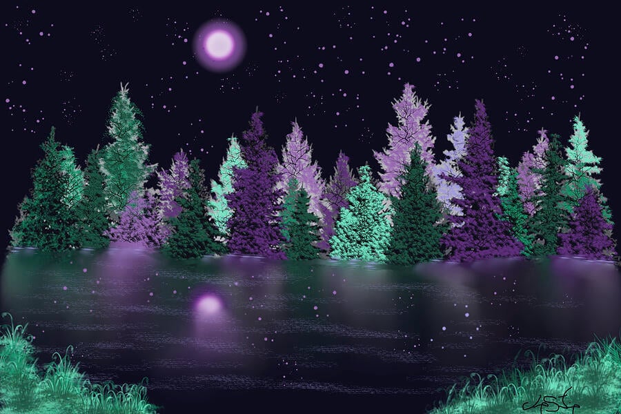 A serene nighttime scene features a tranquil forest with trees in shades of purple and cyan, reflecting on the still waters below. The sky is dotted with stars, and a luminous full moon casts a gentle glow over the landscape.