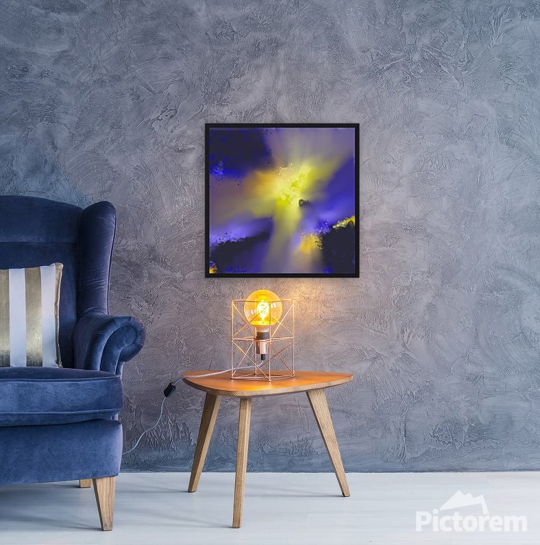 Vibrant splashes of yellow and blue blend together, creating an abstract, ethereal composition. Light seems to burst from the center, radiating energy and movement.