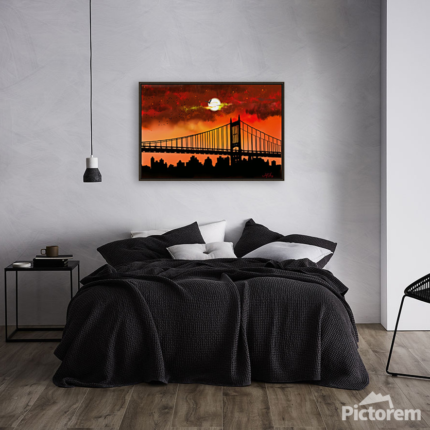 A silhouetted bridge stretches across a fiery sunset sky, with a city skyline beneath and birds flying overhead. The sun peeks through an array of dramatic clouds, casting vibrant orange and red hues across the scene.