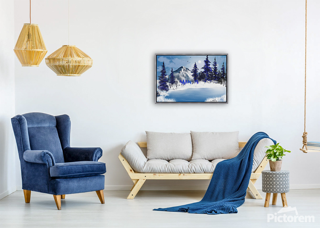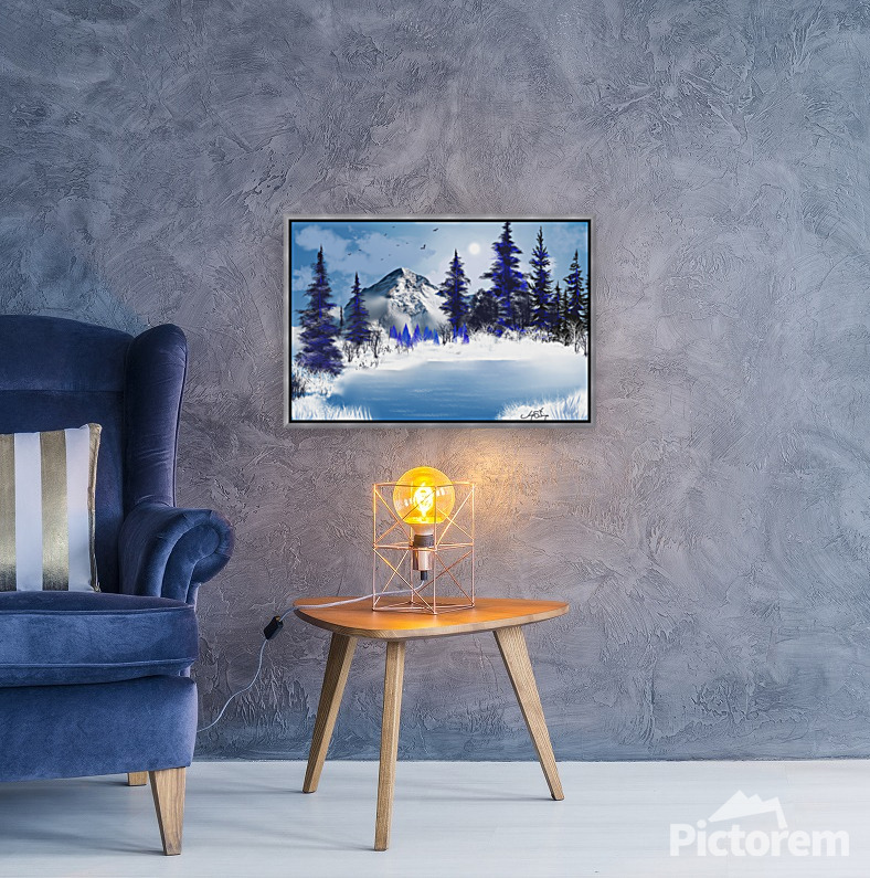 A snowy landscape is depicted with towering blue and black trees framing a serene, frozen lake. In the background, a majestic mountain rises under a bright sun, while several birds soar in the sky.
