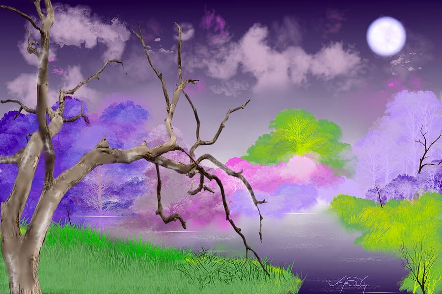 A serene landscape depicts a tranquil river surrounded by vibrant, multicolored trees under a moonlit sky. A bare tree branch reaches out over the lush greenery in the foreground, adding contrast to the scene. Wispy clouds drift across the night sky, enhancing the mystical atmosphere.
