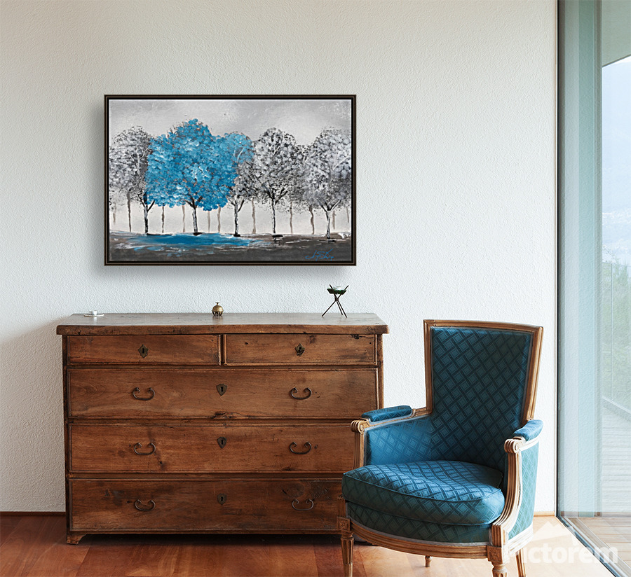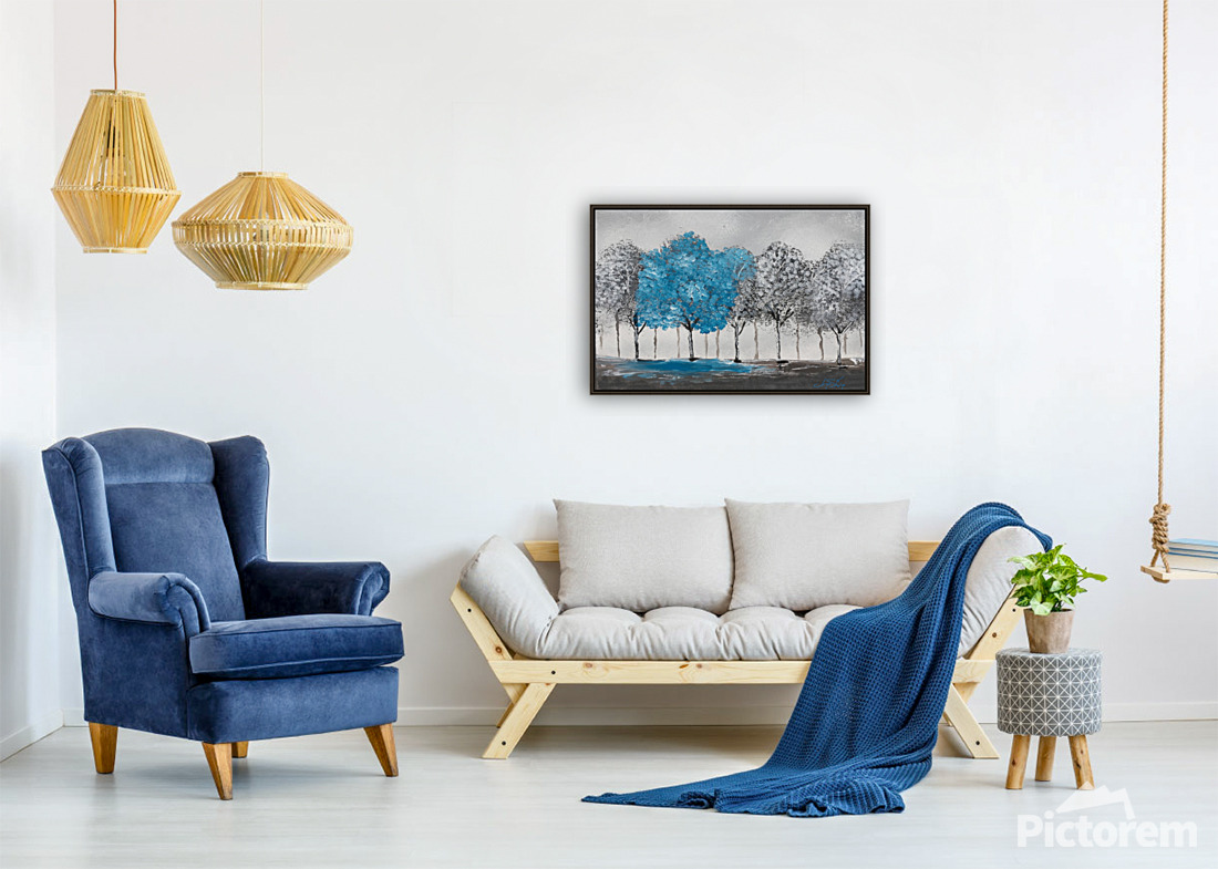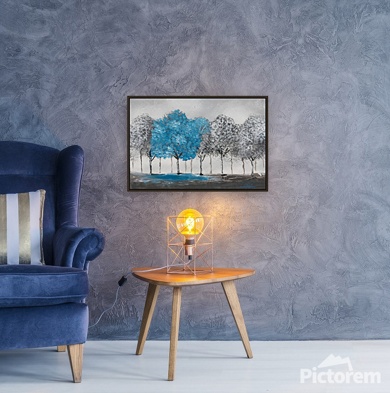 A row of trees is depicted with one tree standing out in vibrant blue, contrasting against the grayscale background of the surrounding trees. The scene evokes a sense of tranquility and visual interest with its unique color palette.