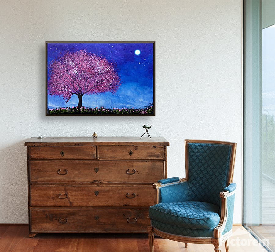 A vibrant cherry blossom tree stands majestically against a backdrop of a starry night sky. The luminous moon casts a gentle glow over a field of blooming flowers beneath the tree.