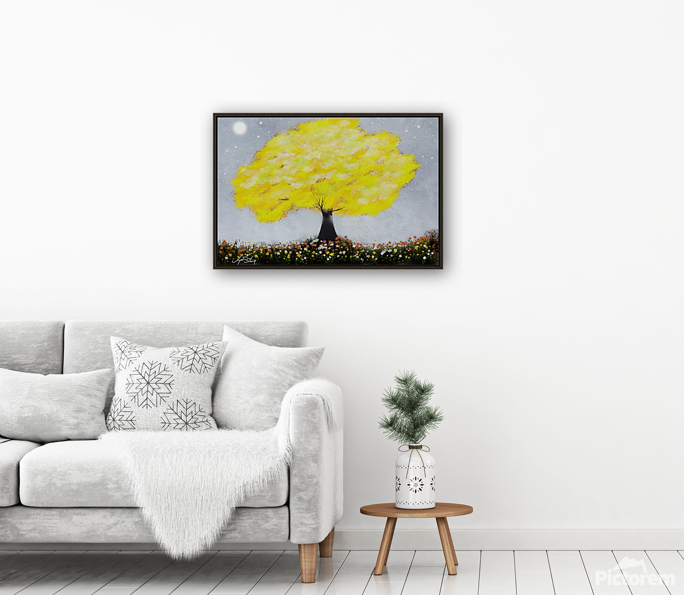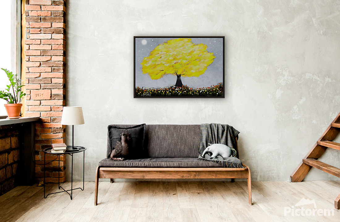 A lone tree with vibrant yellow leaves stands against a starry night sky. Wildflowers bloom in an array of colors at its base, creating a lively and whimsical scene.