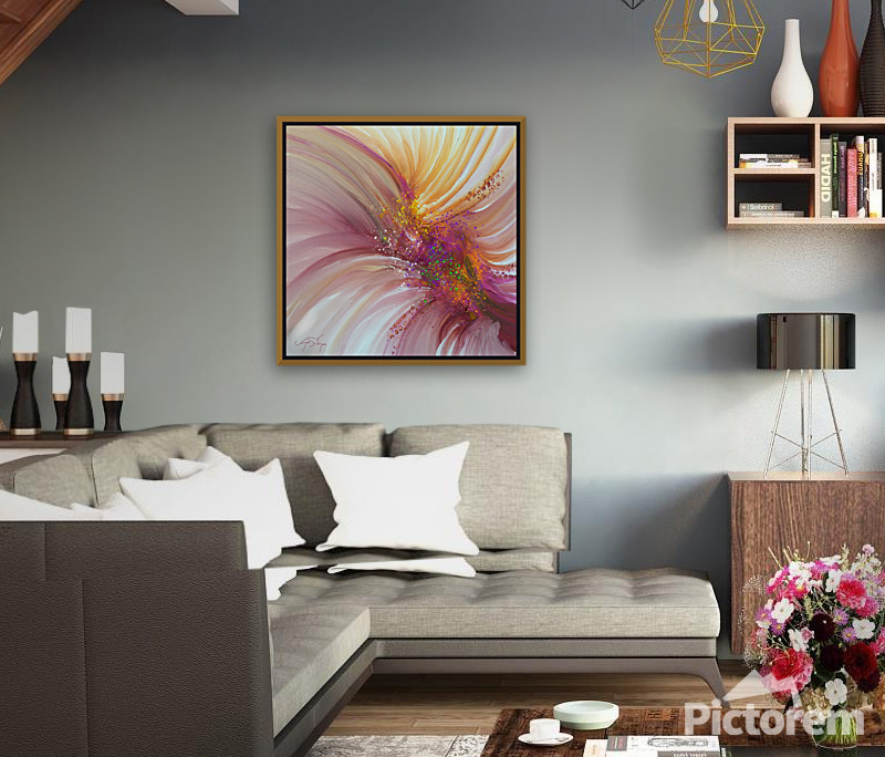 Swirling, dynamic brushstrokes blend together in soft pink and orange hues, creating a vibrant sense of movement and energy. Splashes of bright colors such as purple, green, and yellow add an explosive, lively effect to the scene.
