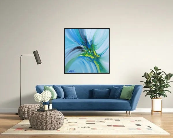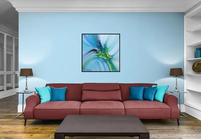 Dynamic swirls of blue and green converge at the center with splashes of black and yellow, creating an energetic focal point. Fluid motions suggest an abstract representation of a burst or explosion.
