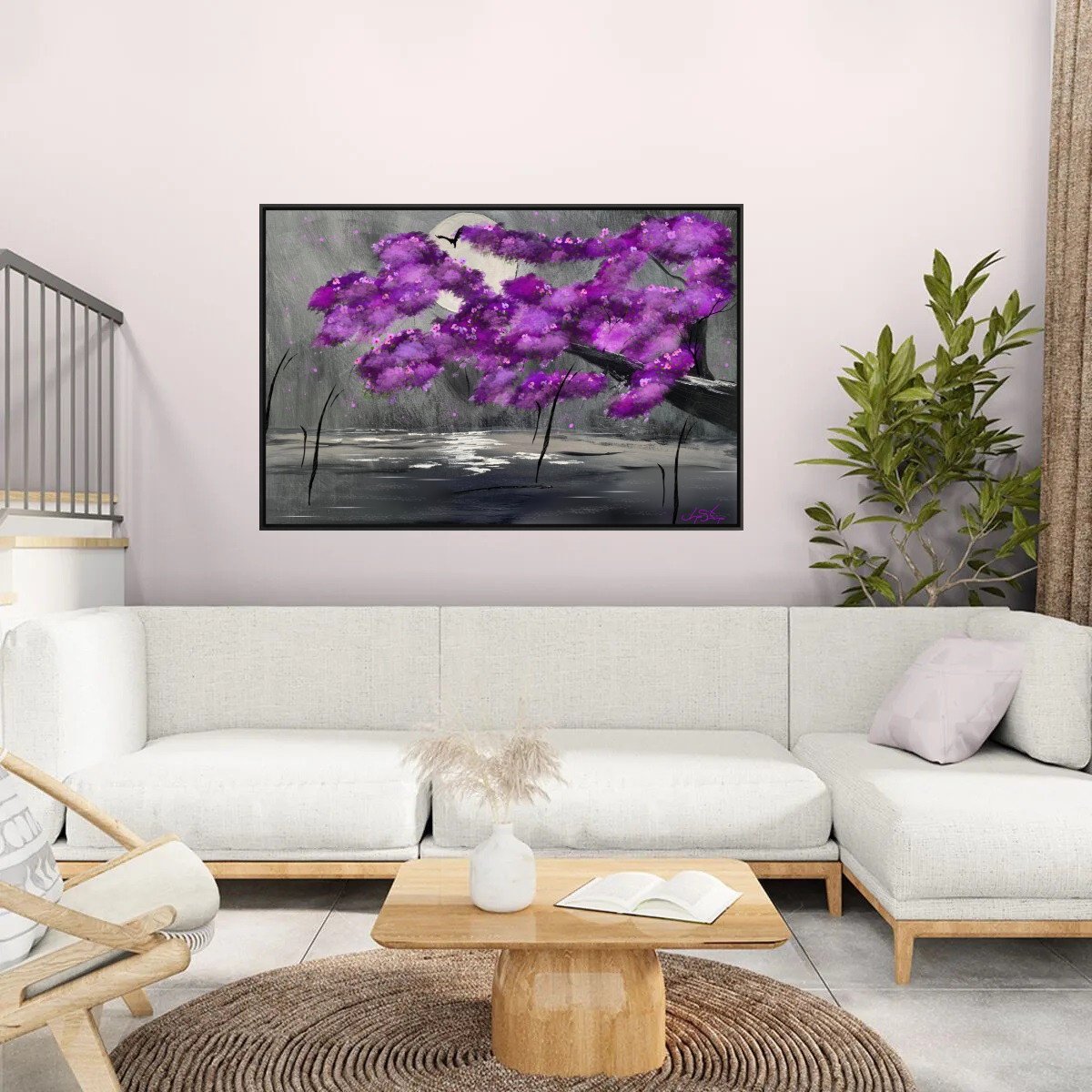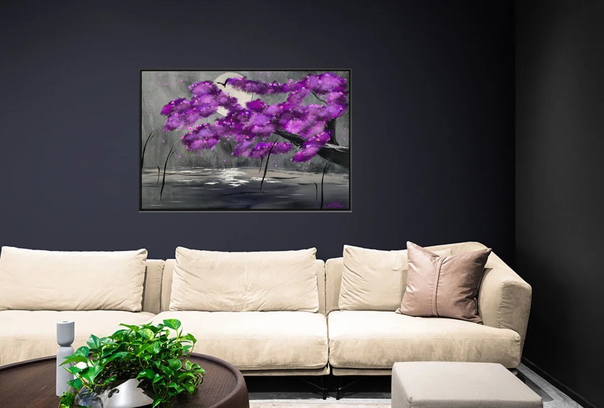 A vibrant cherry blossom tree displays its vivid pink and purple hues, leaning over a reflective body of water under the glow of a full moon. A distant bird is silhouetted against the moonlit sky, adding a sense of depth and serenity to the scene.