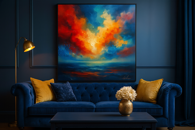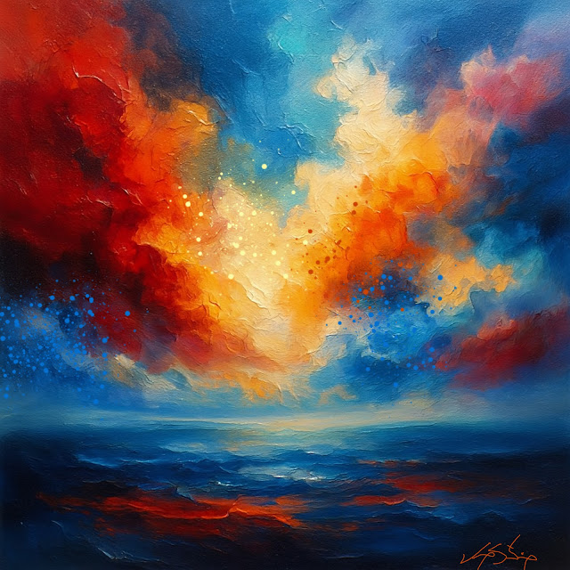 A storm of color unfurls across the canvas—fiery reds and molten oranges erupt from the heart of the sky, colliding with cooler blues and violet shadows that drift toward the edges like fading echoes. The brushwork is bold, urgent, and alive, capturing a moment of elemental transformation. Below, the water reflects the chaos above with quiet reverence, its surface rippling with borrowed light. This painting is a meditation on contrast: energy and stillness, eruption and surrender, fire and silence. It invites the viewer to stand at the threshold of emotion and atmosphere, where nature becomes metaphor and color becomes feeling.