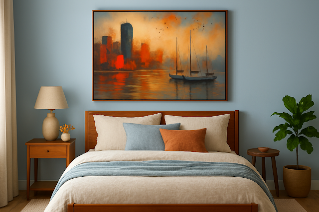 This piece evokes a moment suspended between serenity and intensity, where nature and architecture converge in a palette of ember, gold, and steel blue. It invites viewers to linger in the quiet tension of dusk, where every reflection carries the weight of memory and possibility.