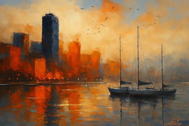 A luminous cityscape unfolds across the canvas, where the tranquil waters of Ember Bay mirror the fiery hues of a setting sun. Two sailboats rest quietly in the foreground, their masts slicing through the warm glow as reflections ripple beneath them. The skyline rises behind in dramatic contrast—towering buildings bathed in molten orange and crimson, anchored by a single dark monolith that commands the horizon. A flock of birds drifts across the sky, adding motion to the stillness and hinting at unseen stories beyond the frame.