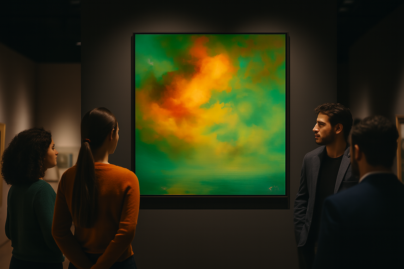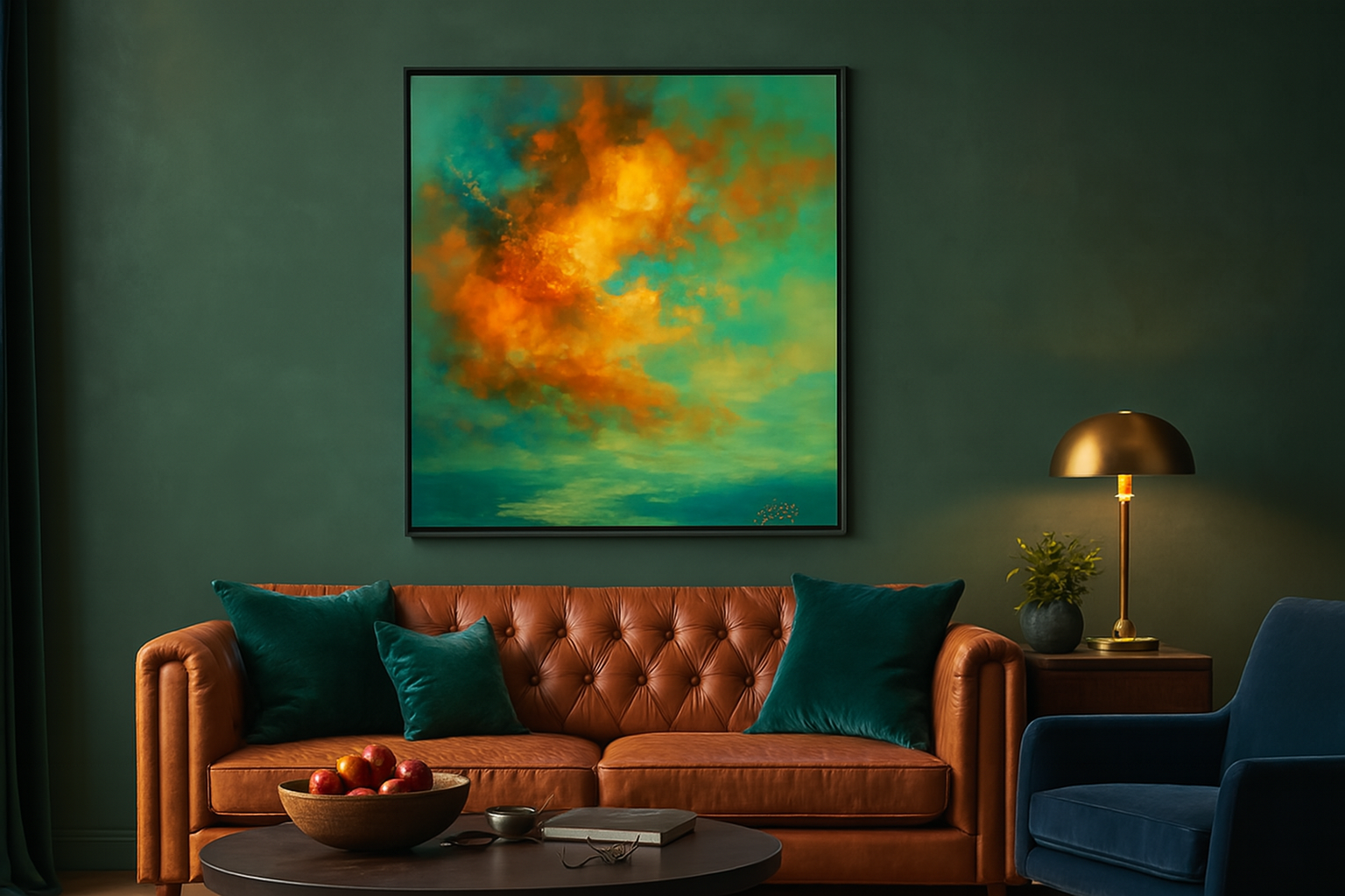 A luminous storm unfolds across the canvas—swirling clouds of molten orange, ember-red, and golden yellow erupt against a backdrop of tranquil teal and turquoise. The sky pulses with energy, as if lit from within by a cosmic ignition, while scattered flecks of light shimmer like distant stars caught in the blast. Below, the ocean remains still, its soft green and blue tones reflecting the drama above with quiet reverence. This piece captures the tension between chaos and serenity, evoking a moment of transformation suspended in time. It invites the viewer to witness not just a celestial event, but an emotional awakening.