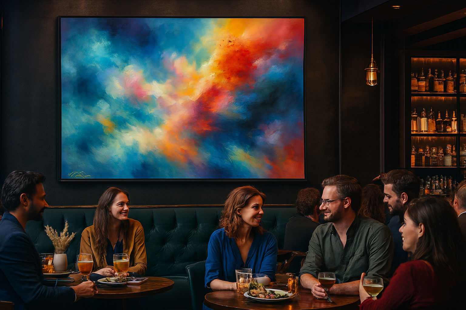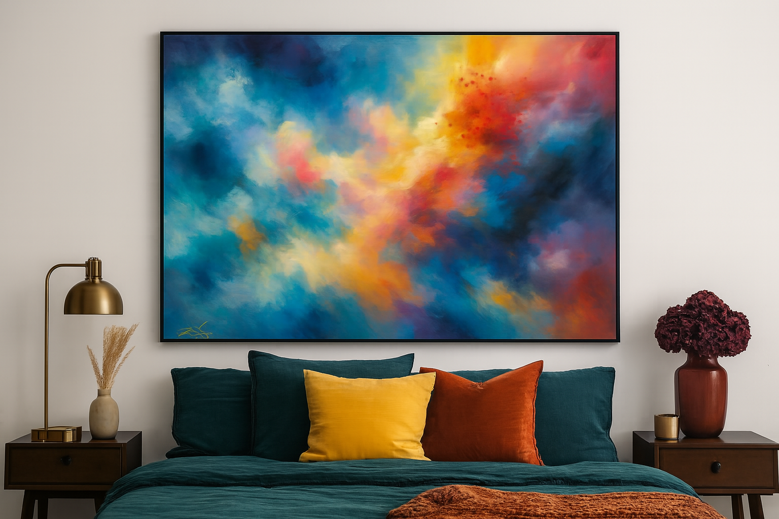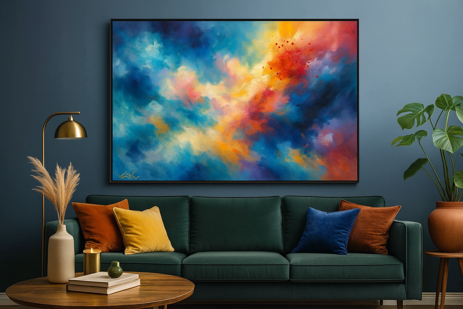 A vibrant depiction of swirling clouds painted in rich blues, oranges, and yellows. Red splatters add a dynamic effect to the abstract composition.