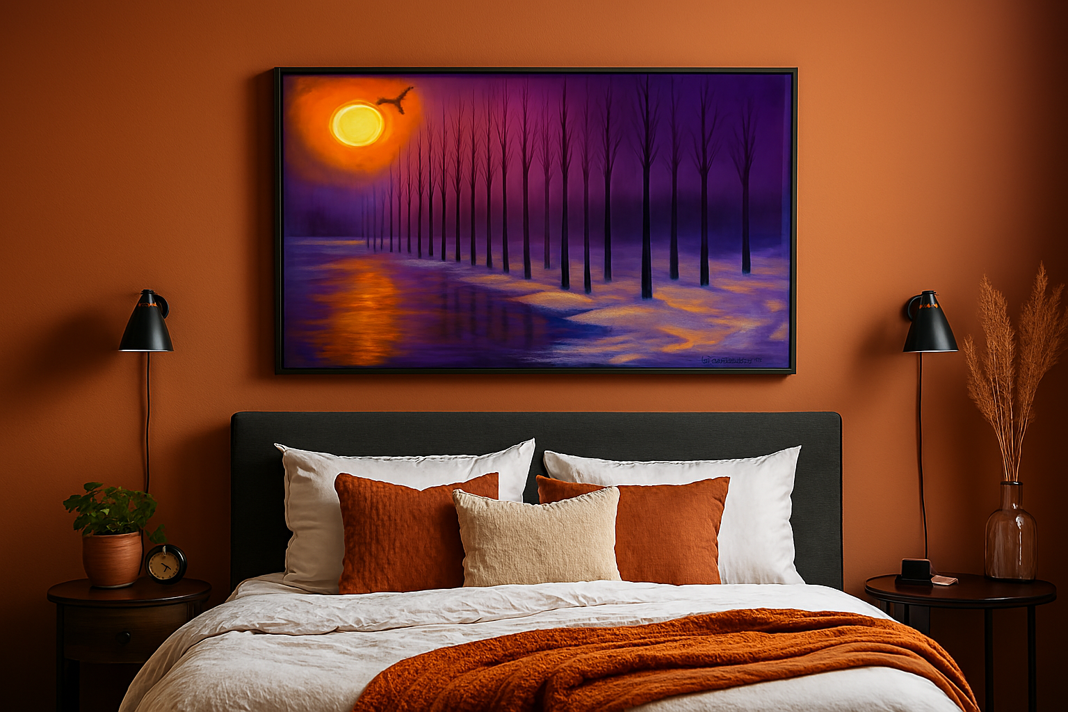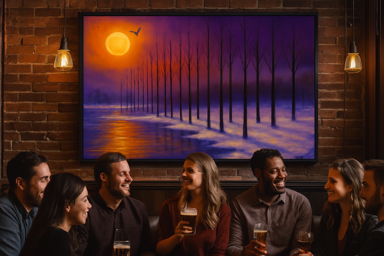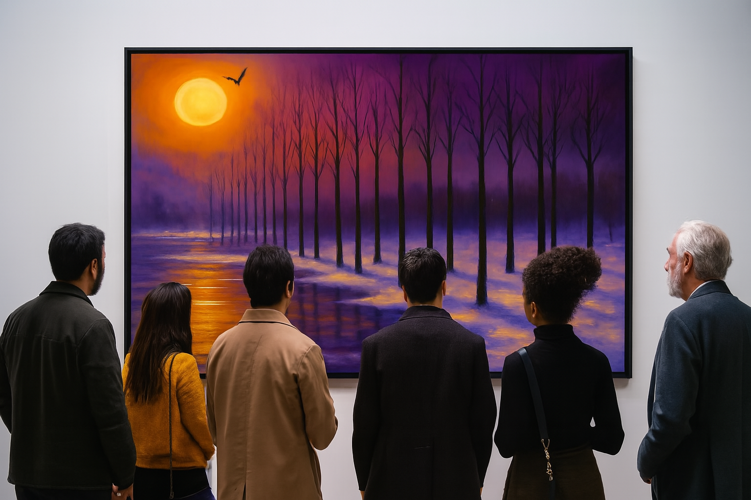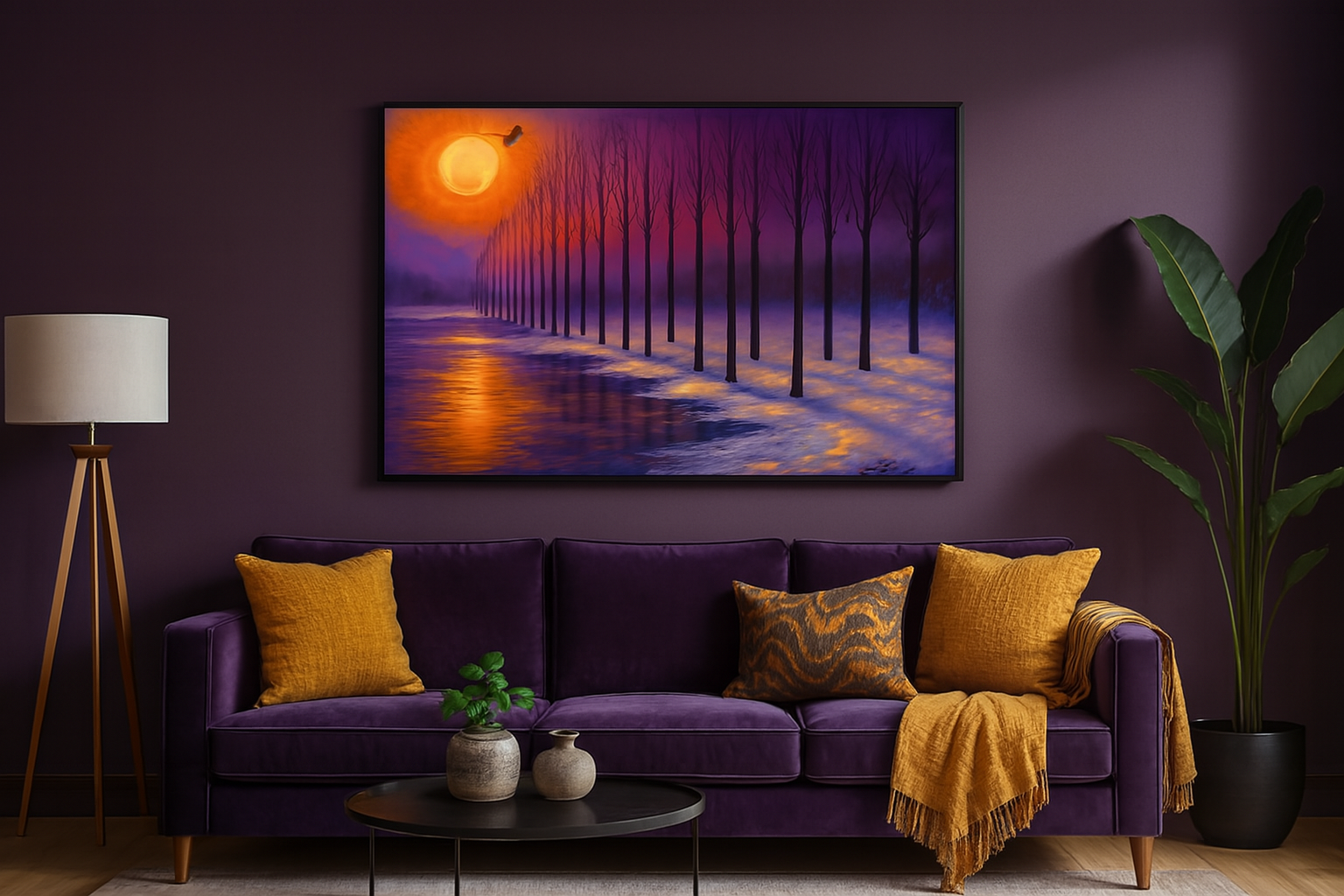 A vibrant sunset casts warm hues over a snowy landscape lined with bare trees. A lone bird flies across the colorful sky.