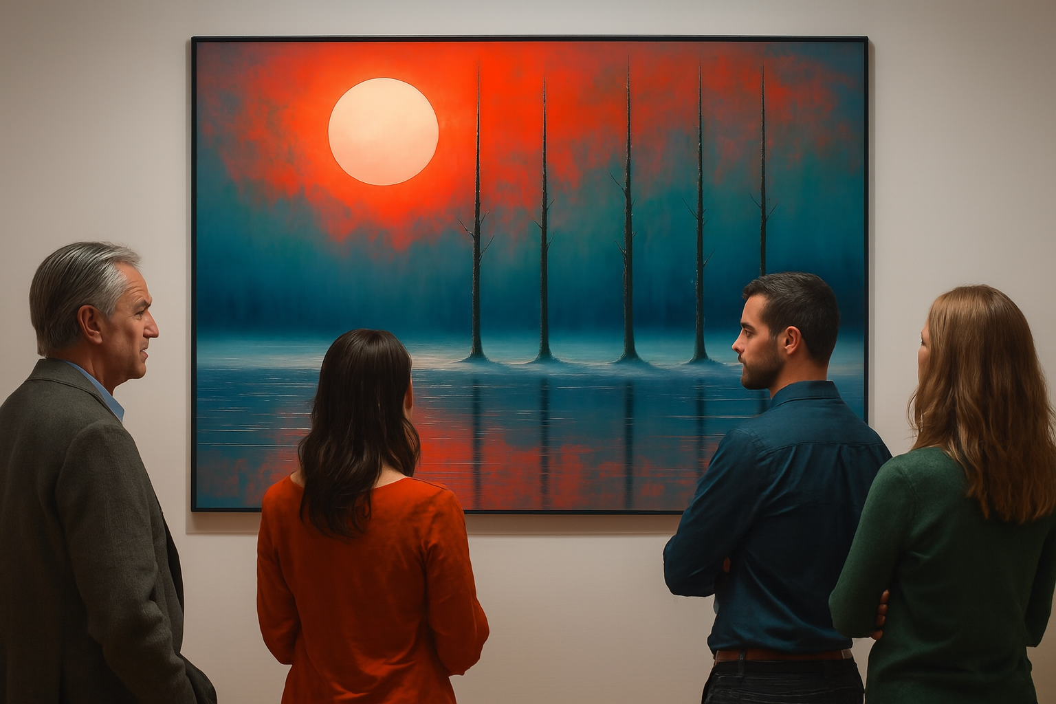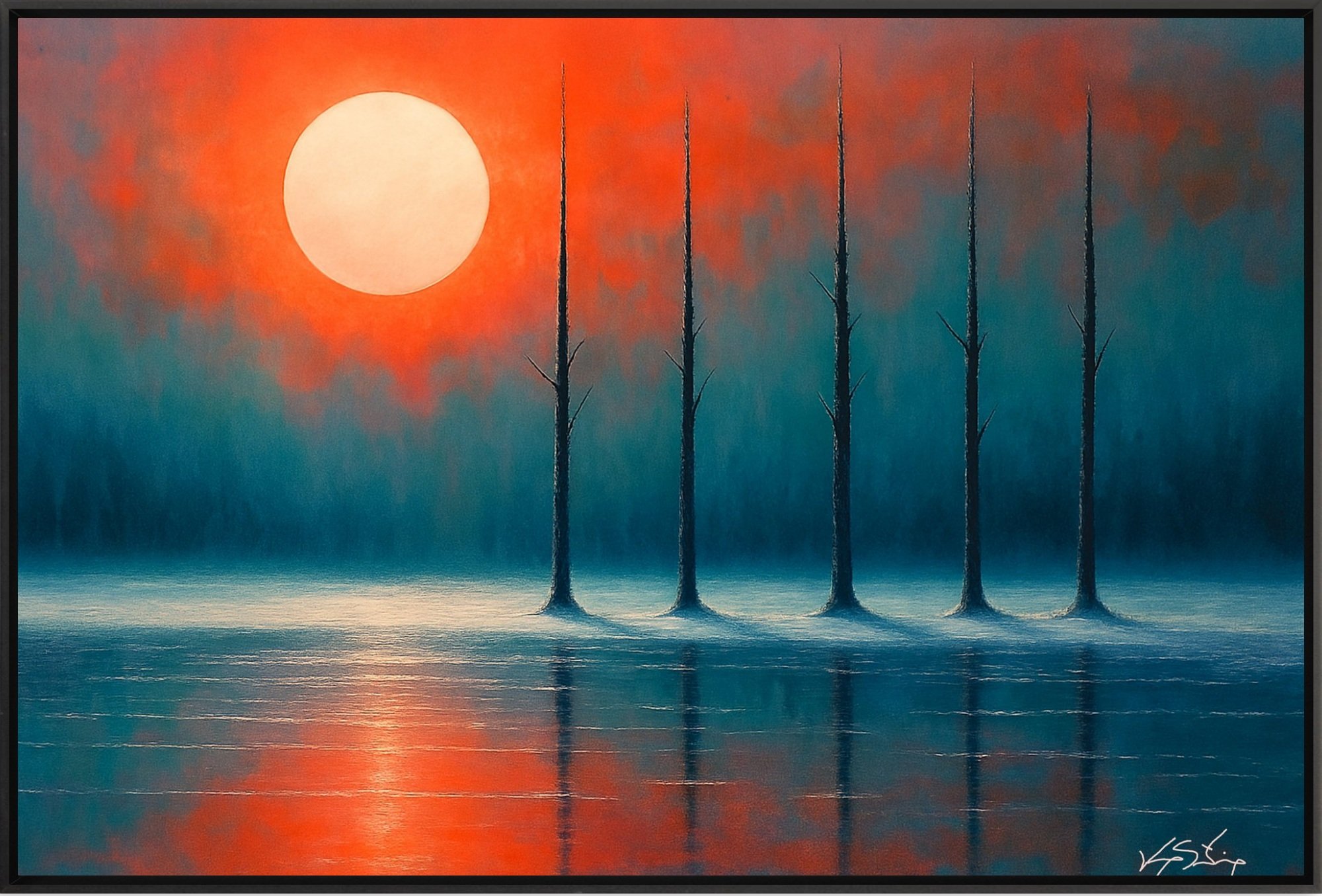 Tall trees stand silhouetted against a vibrant sunset, their reflections mirrored in the tranquil water below. The strong contrast between the warm sun and the cool blue tones creates a striking visual effect.