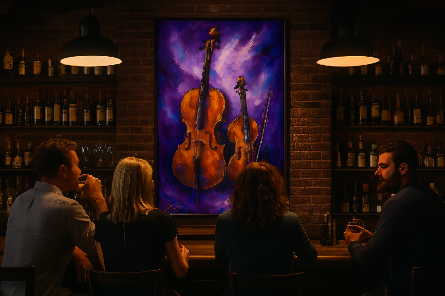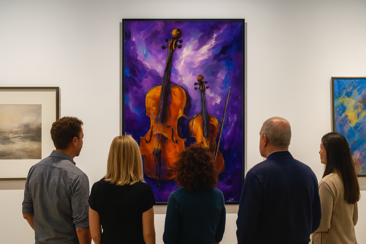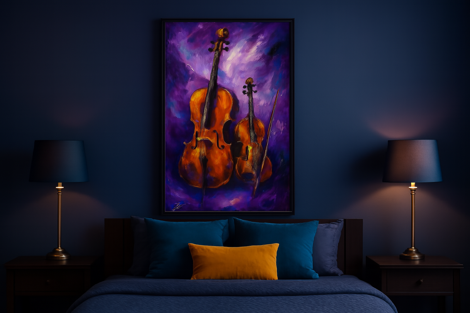 A vibrant depiction of a cello and violin positioned against a swirling purple backdrop. The rich use of oranges and purples creates a dynamic contrast.