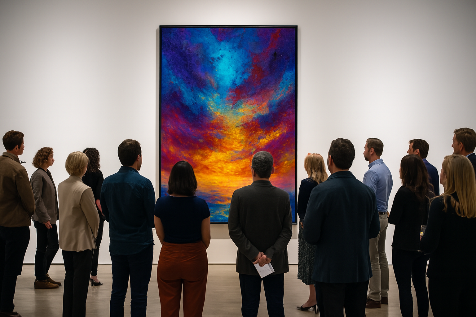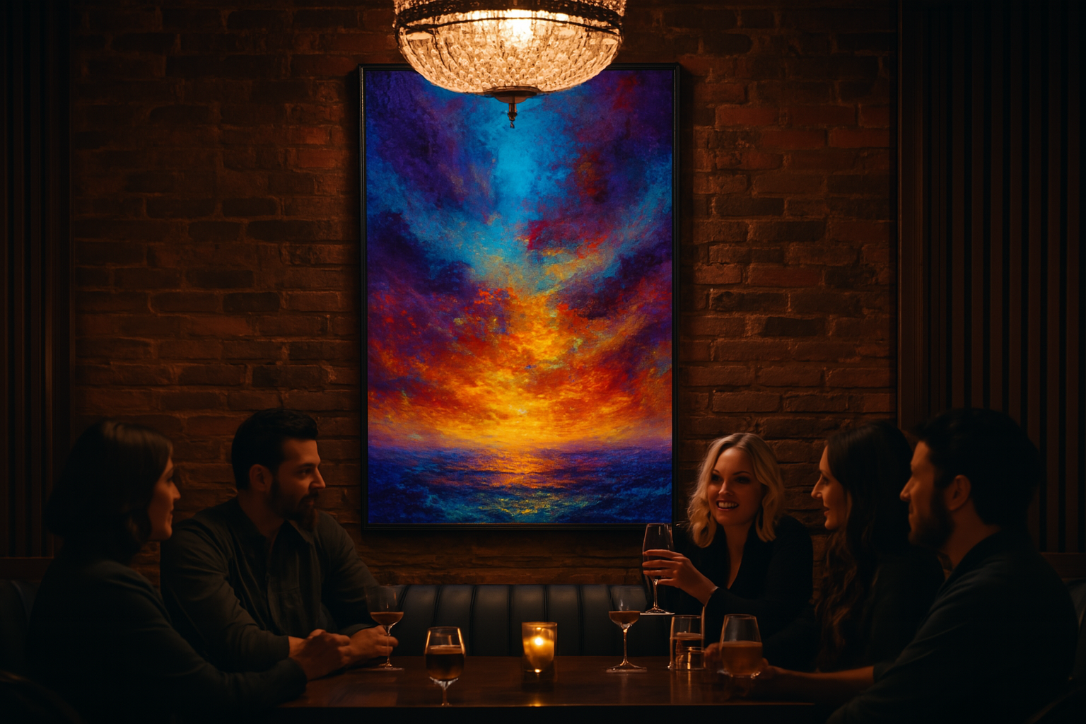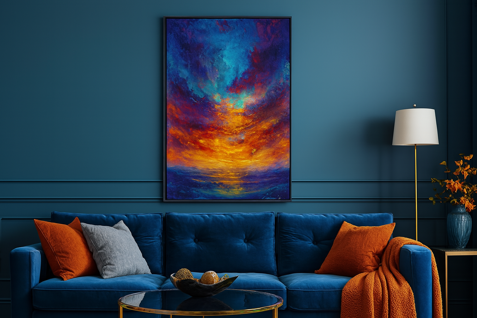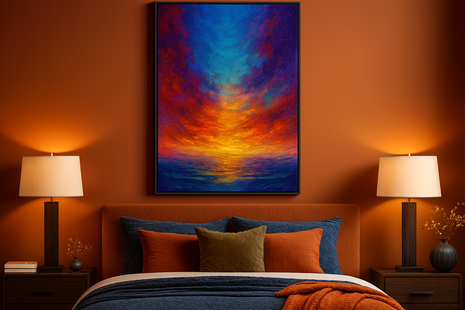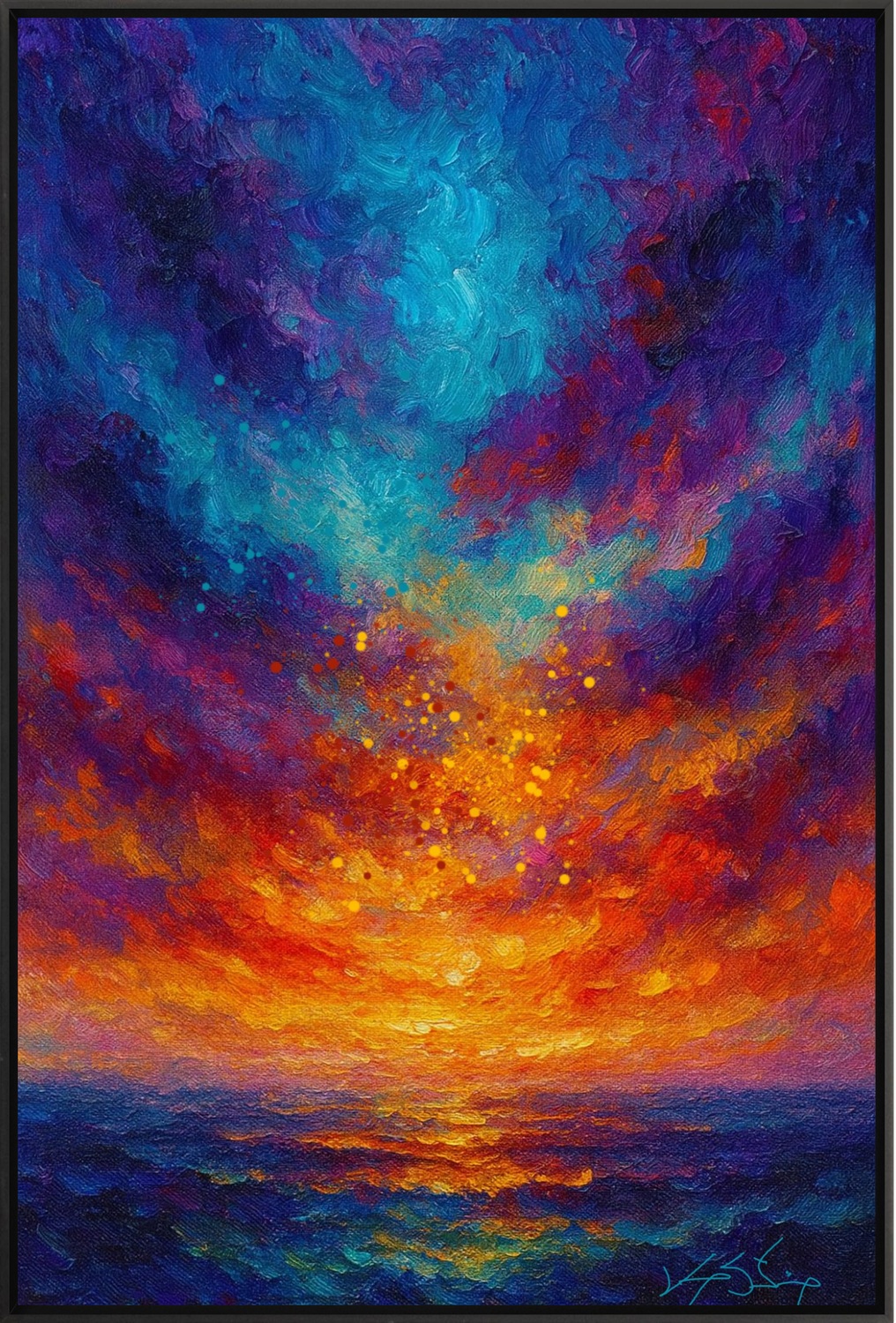 A stunning sunset over the ocean with vivid colors blending into the water and sky. Warm tones of orange and red contrast with deep blues and purples.